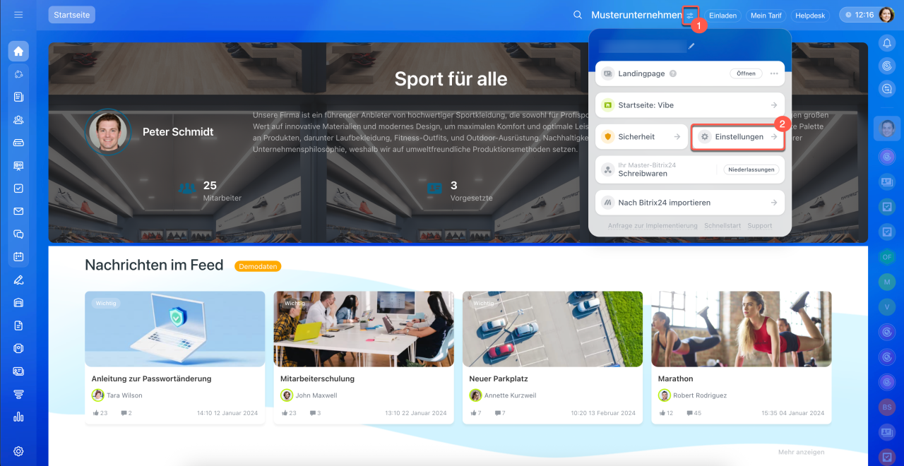 1–2. Klicken Sie auf die Schaltfläche neben dem Namen Ihres Bitrix24 und öffnen Sie die Einstellungen (⚙️).