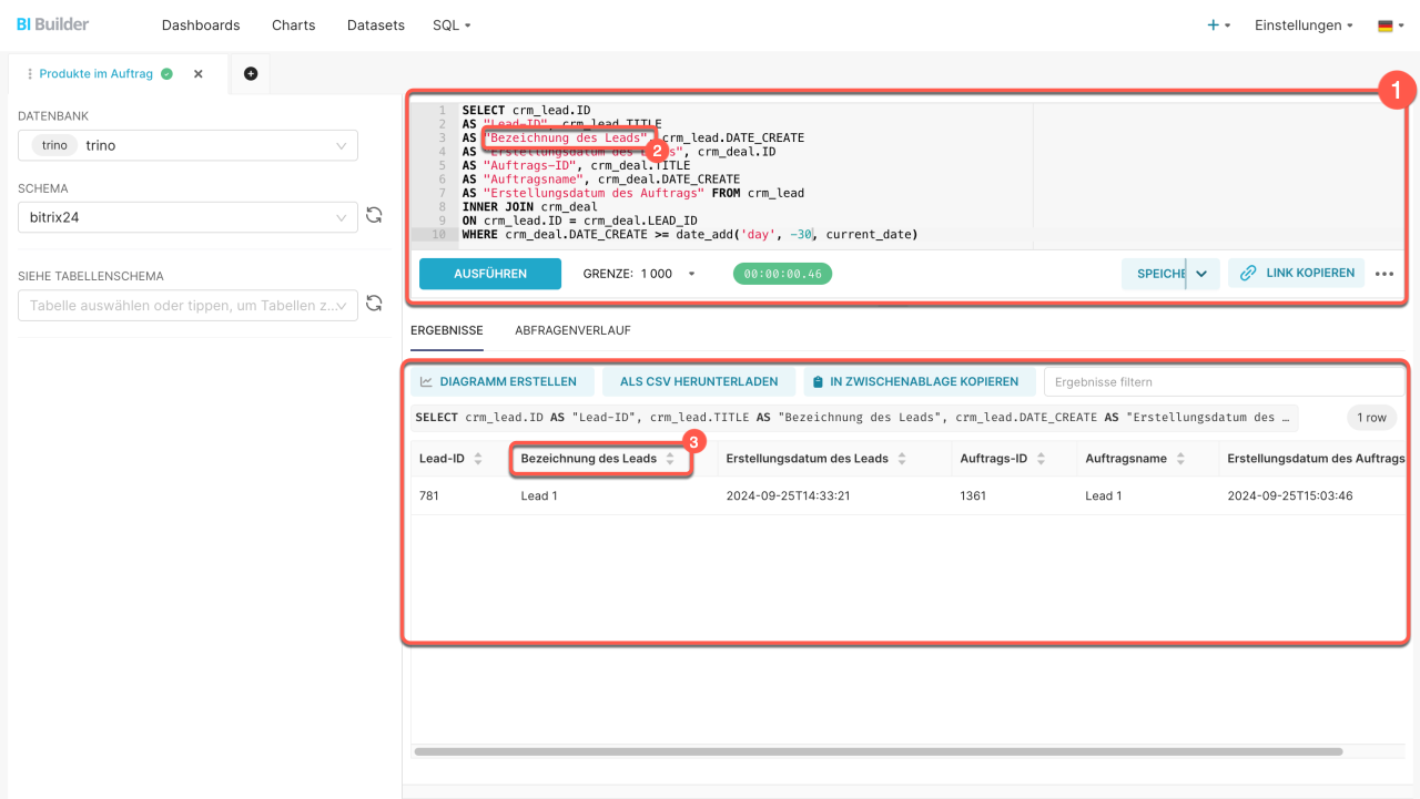 Standardmäßig übernimmt der BI-Builder die Feldbezeichnungen aus der Datenbank und zeigt sie mit den technischen Systemnamen an – zum Beispiel TITLE oder DATECREATE. Um den Bericht übersichtlicher und verständlicher zu gestalten, können Sie benutzerdefinierte Feldnamen direkt in der SQL-Abfrage, in den Datensatzeinstellungen oder in den Diagrammeinstellungen festlegen.