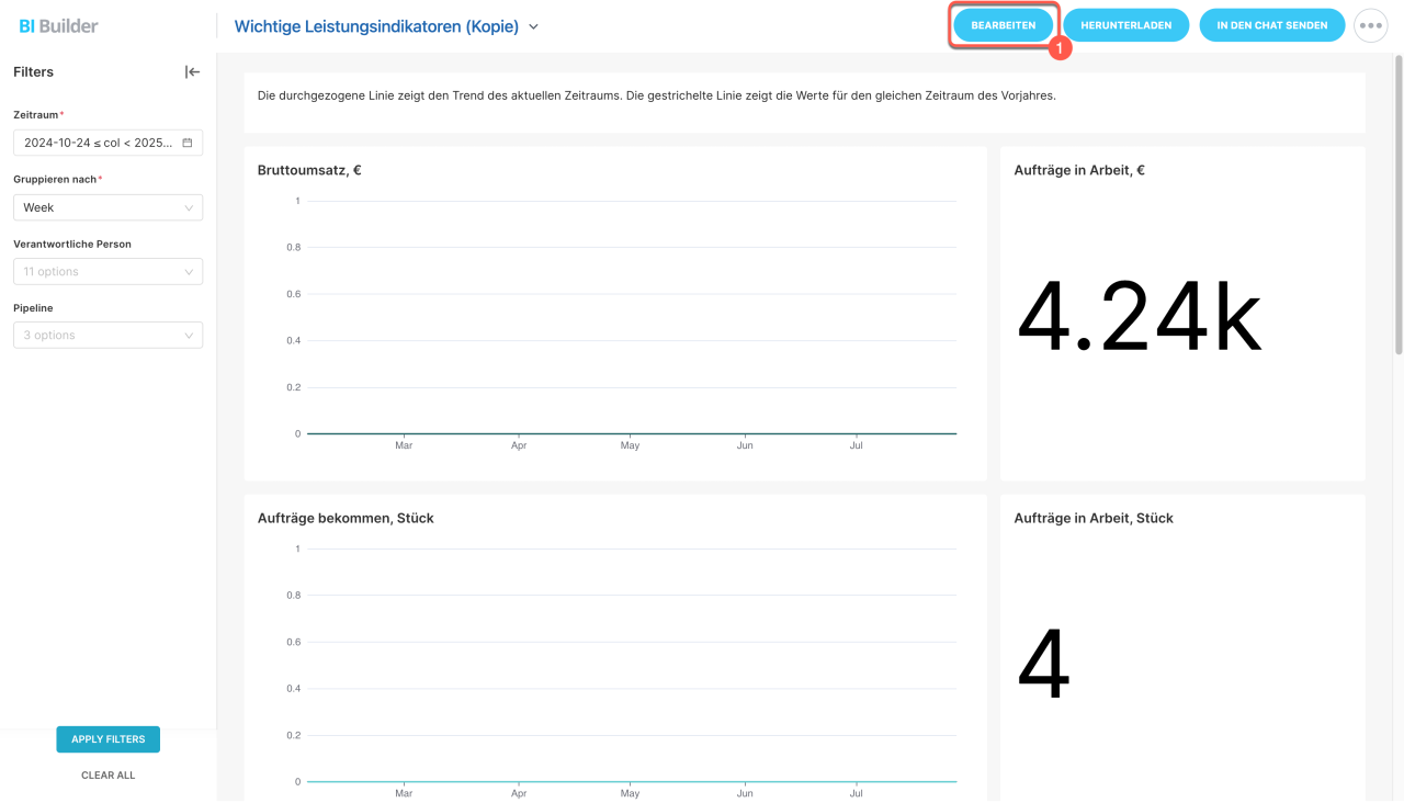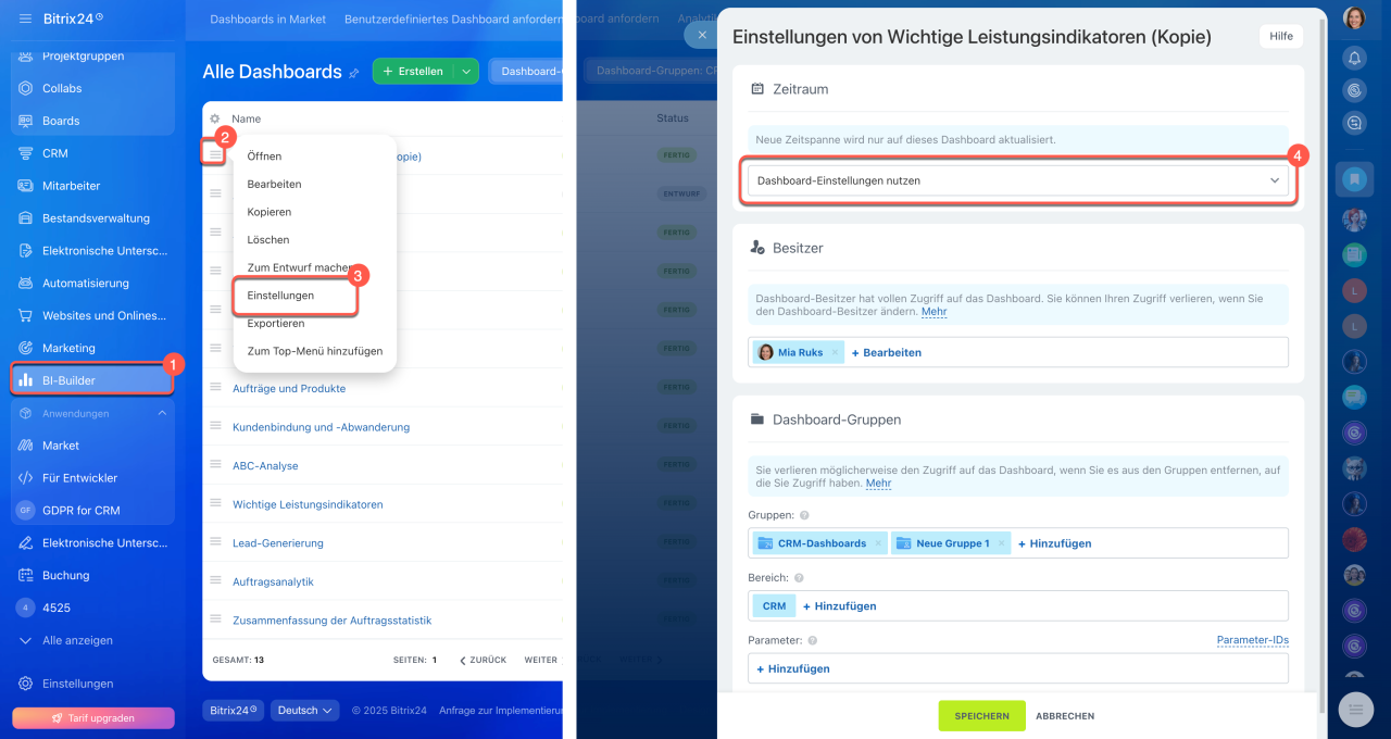 Zeitraum für den Bericht einstellen. Öffnen Sie den Bereich BI-Builder. Wählen Sie den Bericht aus der Liste, öffnen Sie das Menü (≡) und klicken Sie auf Einstellungen. Damit der Bericht den eingestellten Zeitraum aus dem Filter verwendet, wählen Sie die Option Dashboard-Einstellungen nutzen.