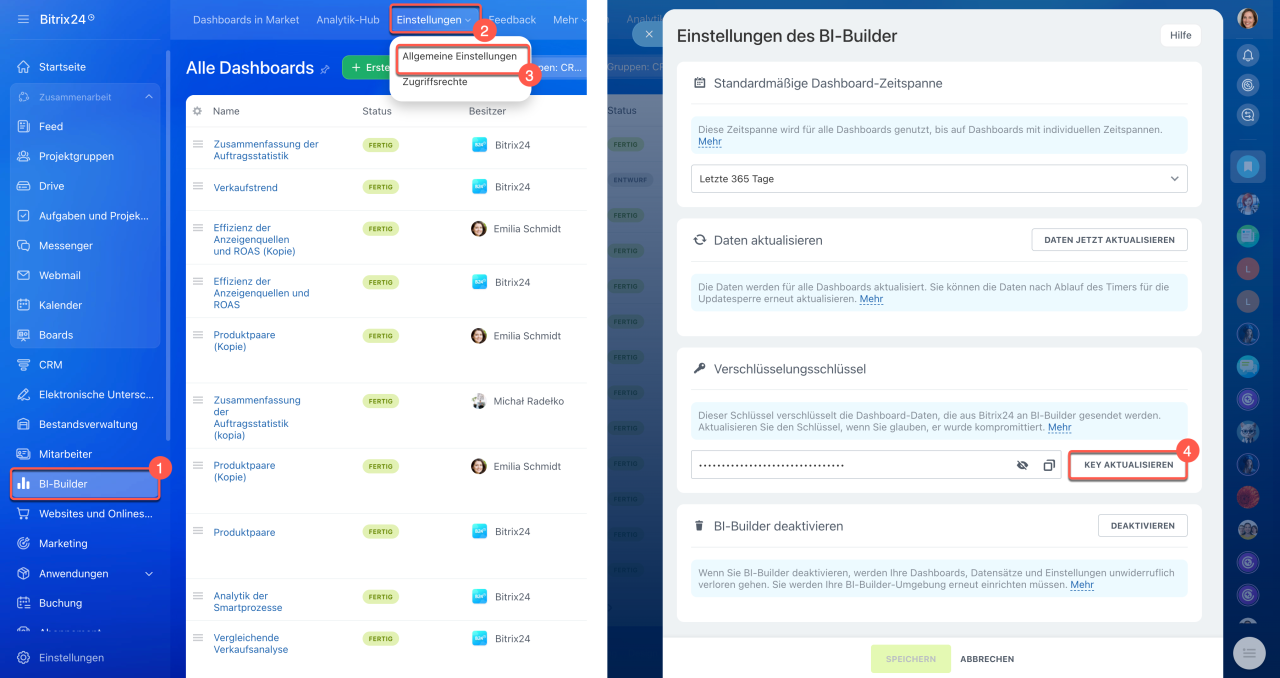 Falls ein Bericht im BI-Builder länger als eine Stunde nicht geöffnet wurde oder beim Laden ein Fehler auftritt, kann das Problem an der Datenquelle liegen. Häufig hängt dies mit Schwierigkeiten beim Abrufen der Daten aus Bitrix24 zusammen. In einem solchen Fall hilft oft das Aktualisieren des Verschlüsselungsschlüssels, um die Berichte wieder funktionsfähig zu machen. Öffnen Sie dazu den Bereich BI-Builder > Einstellungen > Allgemeine Einstellungen und klicken Sie auf Key aktualisieren.
