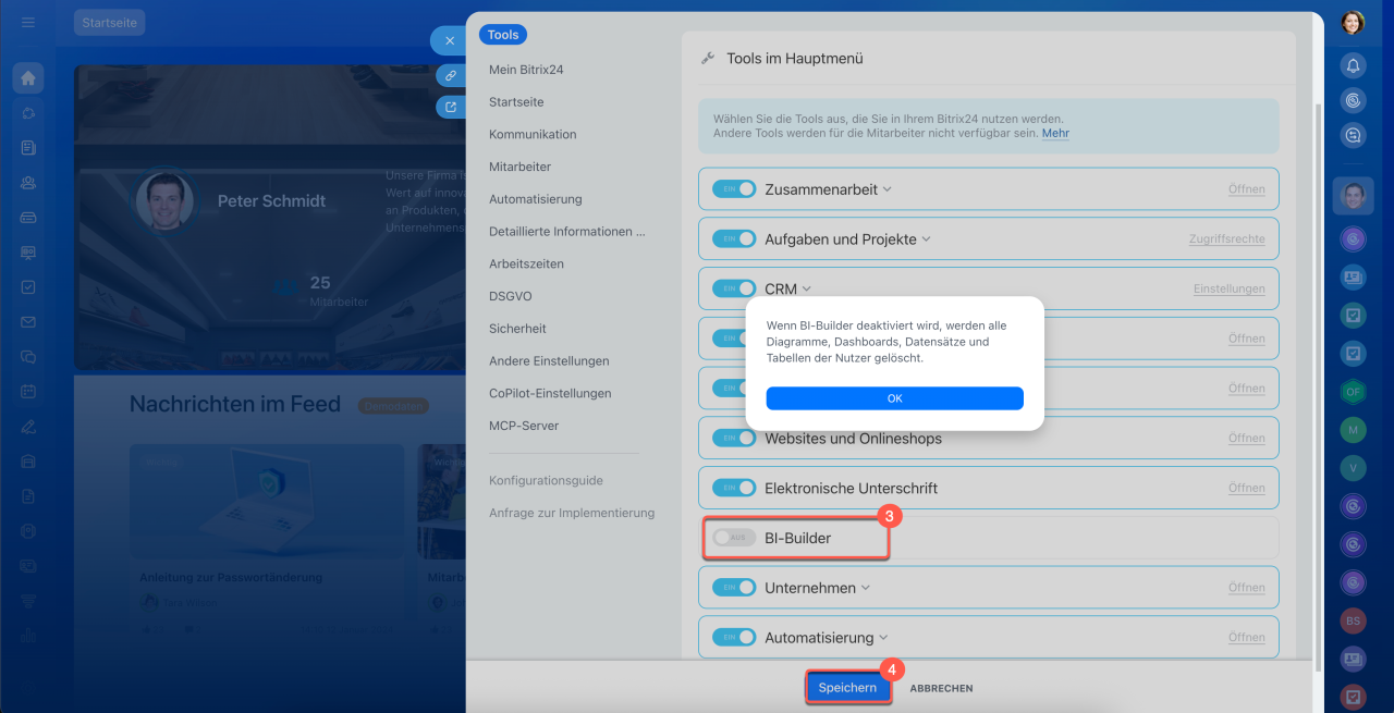 - Der BI-Builder kann in den Bitrix24-Einstellungen deaktiviert werden. Beim Deaktivieren des BI-Builders werden alle Einstellungen, Diagramme und benutzerdefinierten Dashboards gelöscht. Bei einer erneuten Aktivierung werden sie erneut eingerichtet.
