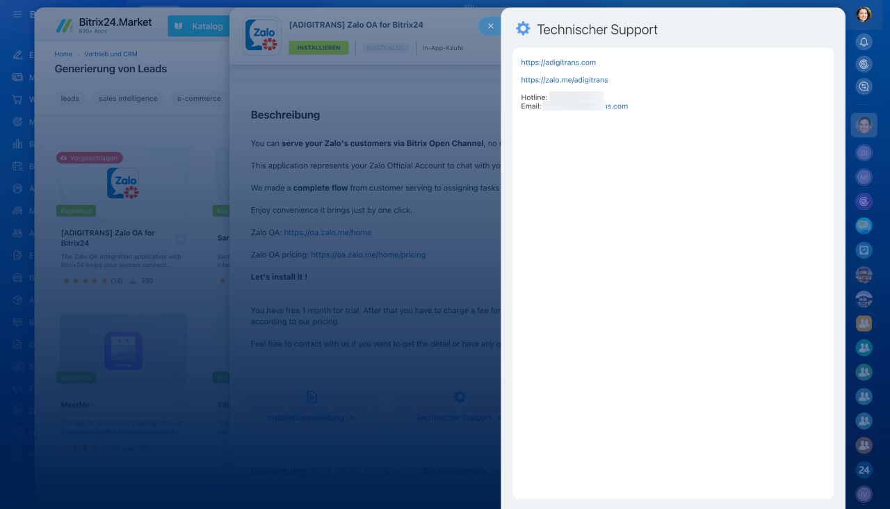- Der technische Support von Bitrix24 bietet Unterstützung nur für die Apps von Bitrix24 und Bitrix24 Integrations an.