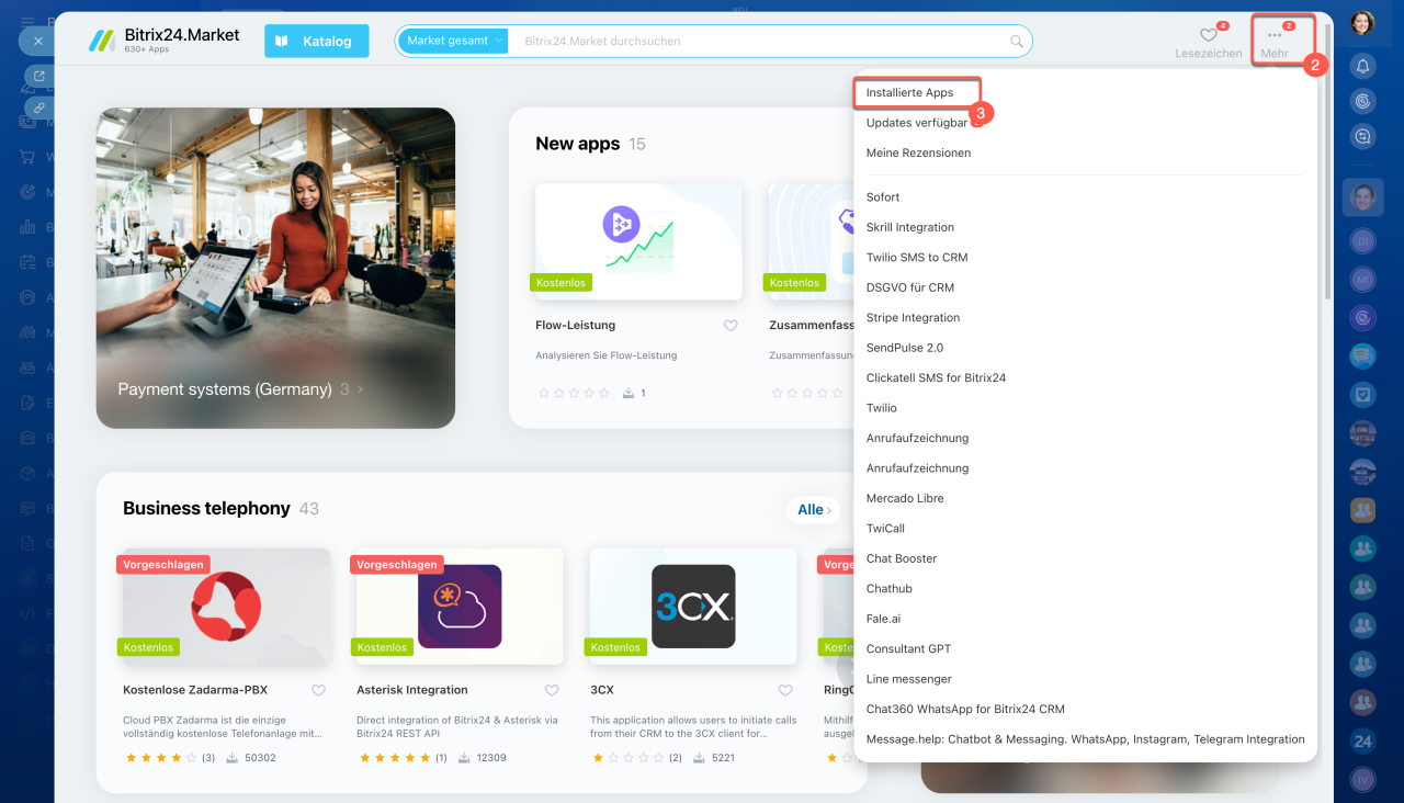 Im Bitrix24 Market stehen über 550 Apps für verschiedene Geschäftsbereiche zur Verfügung. Diese erweitern die Möglichkeiten von Bitrix24 erheblich. Die meisten dieser Apps werden von Bitrix24-Partnern — externen Entwicklern, erstellt. Sie sind für die Funktionalität ihrer Apps verantwortlich und bieten technische Unterstützung an.
