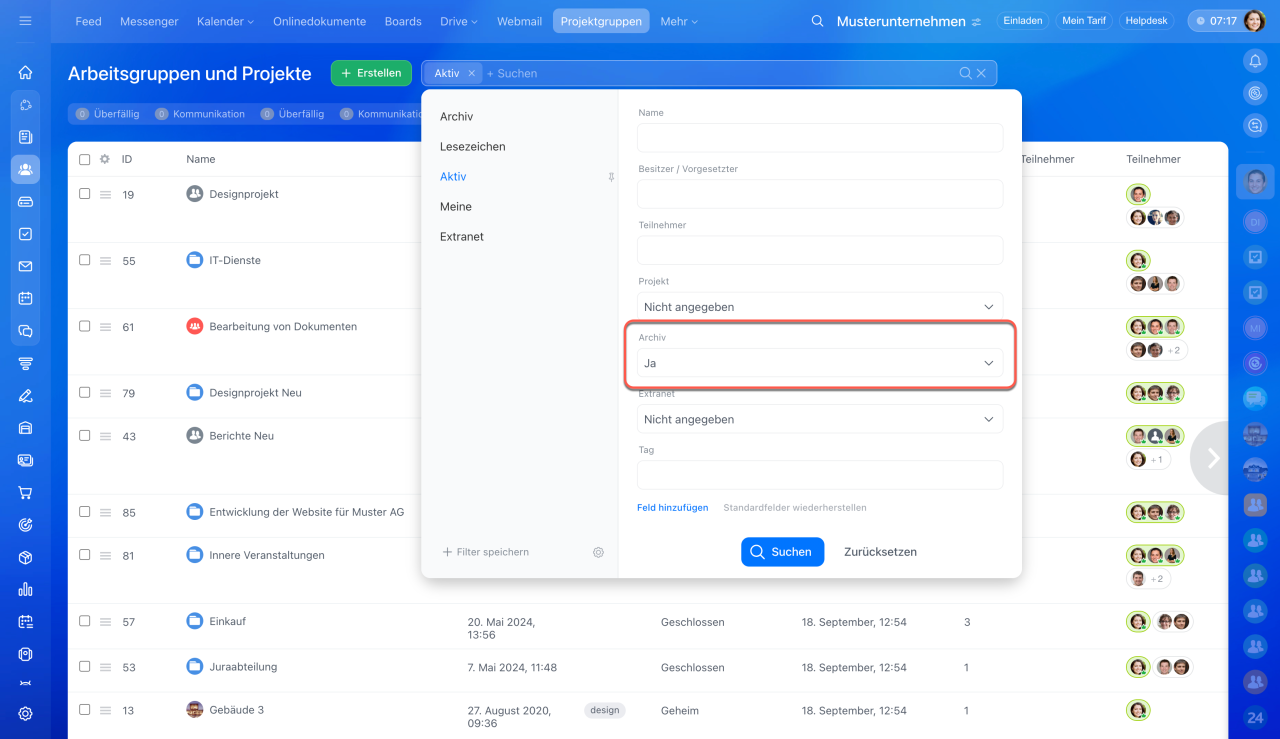 Sobald die Arbeitsgruppe archiviert ist, bleiben alle Daten erhalten. Ihre archivierten Arbeitsgruppen / Projekte können Sie dann mit dem Filter finden.