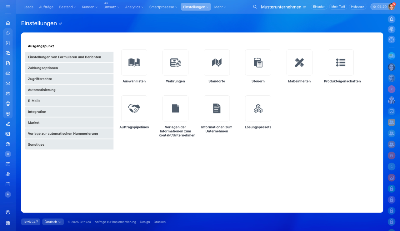 Danach wird den Nutzer den Zugriff auf den Bereich CRM-Einstellungen erhalten.