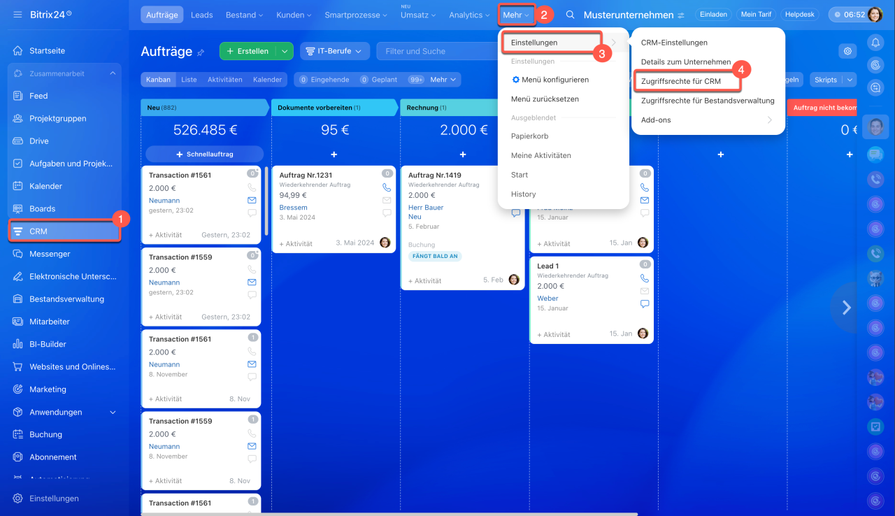 1-4. Öffnen Sie den Bereich CRM > Mehr > Einstellungen > Zugriffsrechte für CRM.