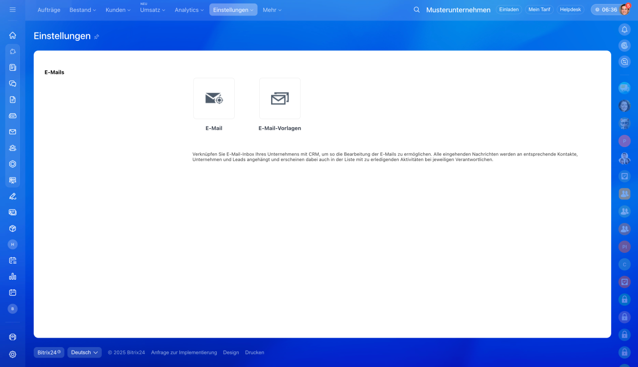 Wenn Sie CRM > Einstellungen > CRM-Einstellungen öffnen und nur den Bereich E-Mail sehen, bedeutet das, dass Sie keine Berechtigung haben, die CRM-Einstellungen zu konfigurieren. Wenden Sie sich an Ihren Bitrix24-Administrator, um Zugriff zu erhalten.