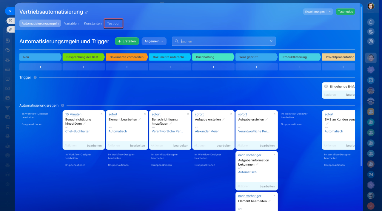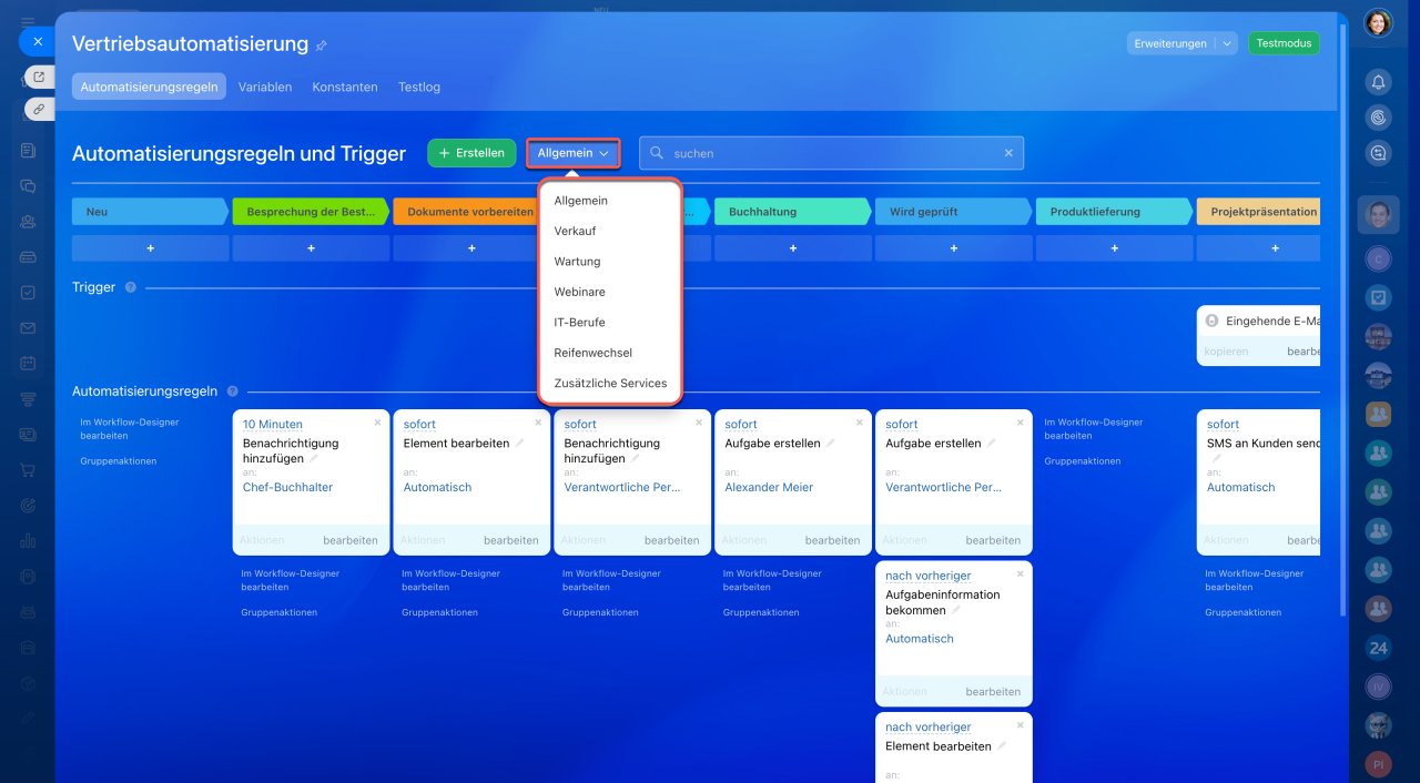 - Im Bereich Verkaufsautomatisierung können Automatisierungsregeln und Trigger hinzugefügt, Variablen und Konstanten angegeben und der Testmodus der Automatisierungsregeln gestartet werden.