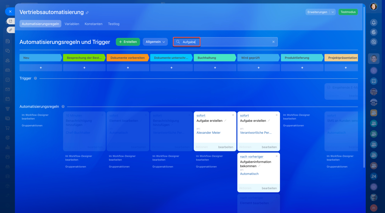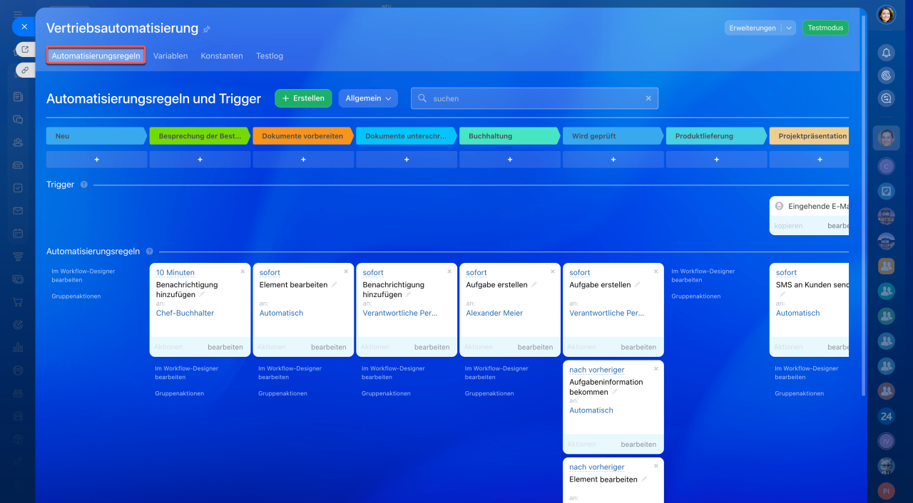 - Am Bereich Automatisierungsregeln können Sie Automatisierungsregeln und Trigger für jede Phase eines CRM-Elements einrichten.