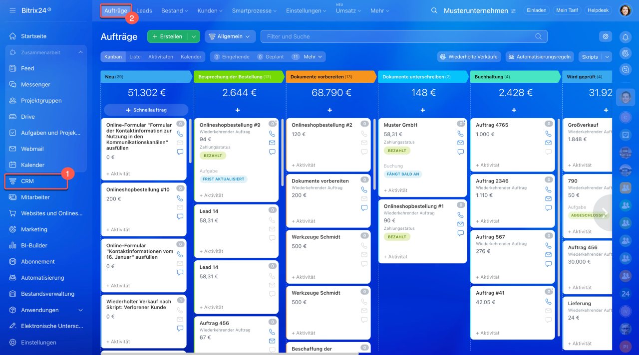 Im Bitrix24 CRM stehen Ihnen zahlreiche Tools zur Verfügung, um Kundenprozesse zu automatisieren. Sie können beispielsweise Aufträge automatisch an Mitarbeiter verteilen, E-Mails und SMS an Kunden senden, Dokumente erstellen und vieles mehr.