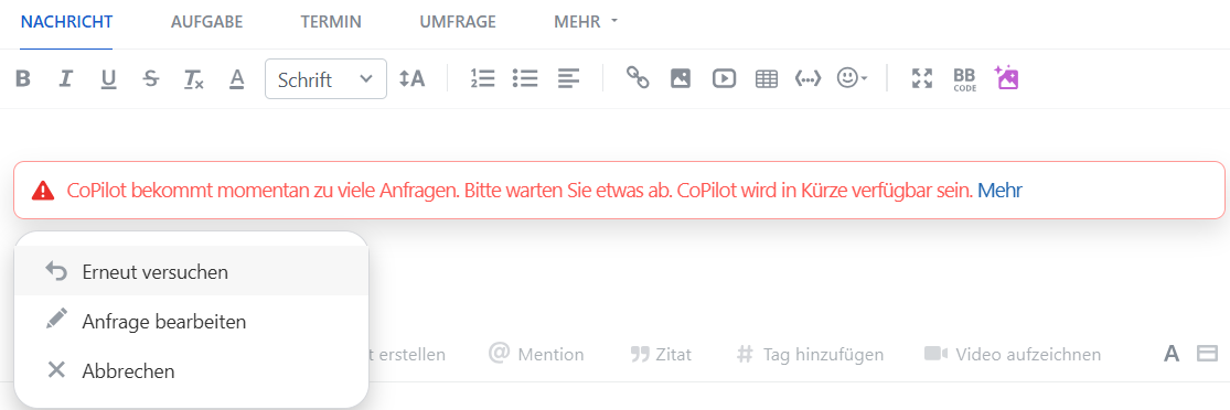Bei jeder Anfrage prüft CoPilot die Anzahl der Anfragen, die in der letzten Stunde eingegangen sind. Sind bereits 600 Anfragen gestellt worden, können keine weiteren Anfragen mehr gesendet werden.