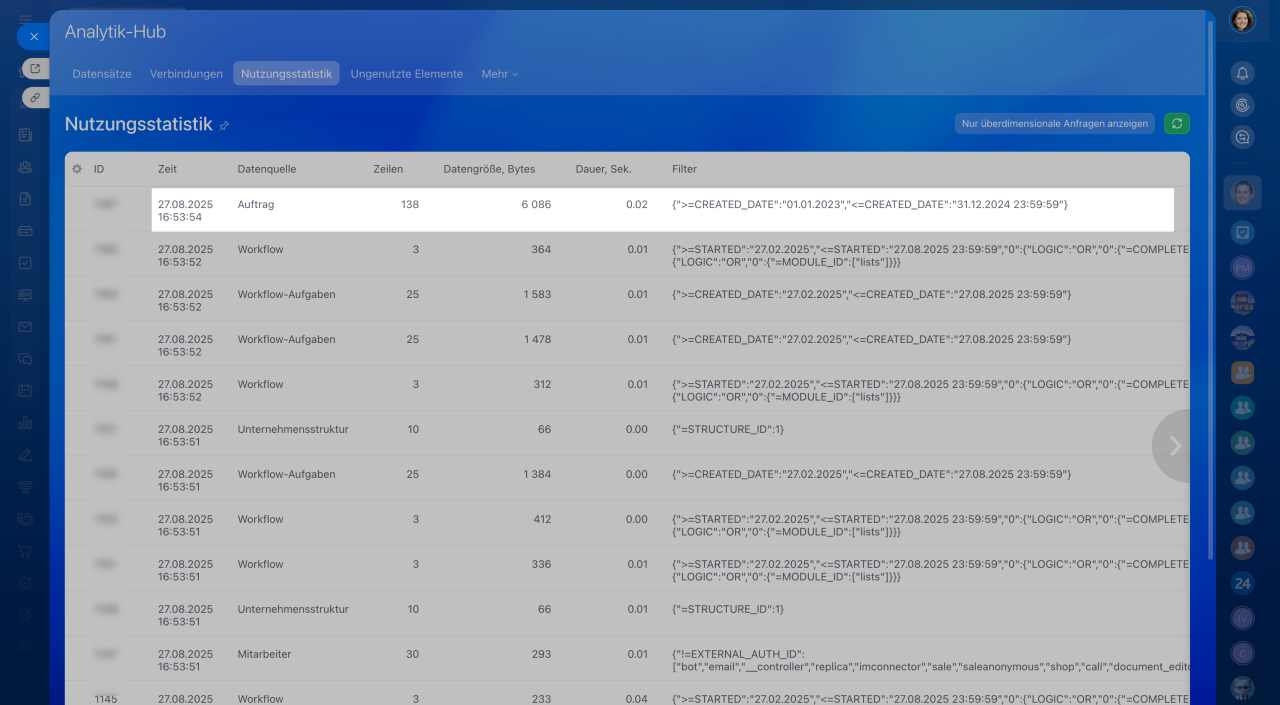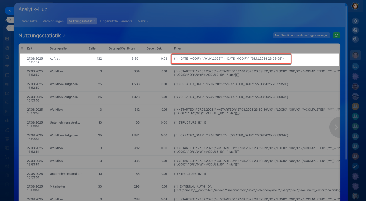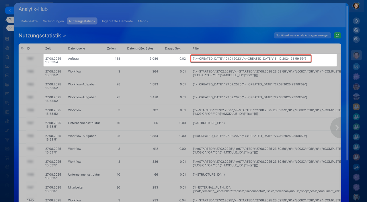 Der Filter begrenzt sofort die Auswahl nach dem Feld DATE_CREATE und lädt nur die benötigten Aufträge. Dies beschleunigt die Abfrageausführung. Im Bereich Nutzungsstatistik wird ein solcher Filter im Format angezeigt: {">=DATE_CREATE":"01.01.2023","<=DATE_CREATE":"31.12.2024 23:59:59"}