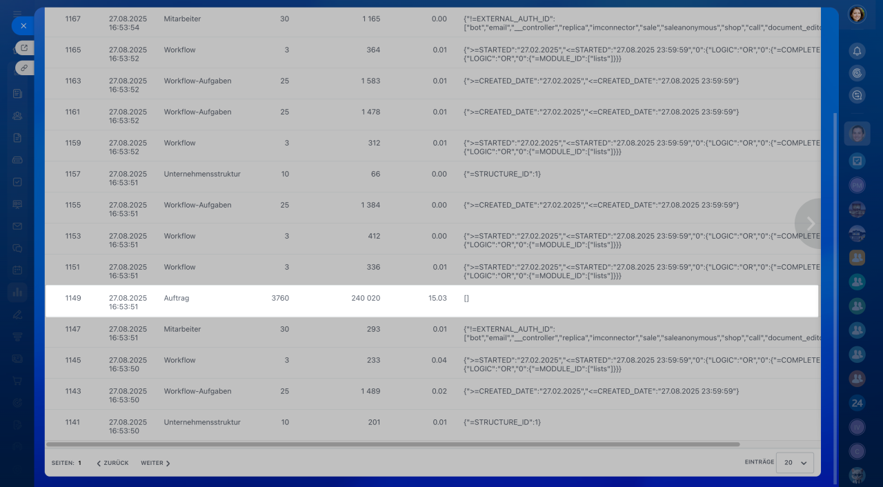 Diagramme in Dashboards werden mithilfe von SQL-Abfragen erstellt. Je schneller diese Abfragen ausgeführt werden, desto schneller werden die Dashboards in Bitrix24 geladen. Durch die Analyse der Statistiken können Sie die Effizienz der Abfragen bewerten. Sollten sie langsam ausgeführt werden oder zu viele Daten laden, können Sie die Abfrage anpassen, um die Leistung der Dashboards zu optimieren.