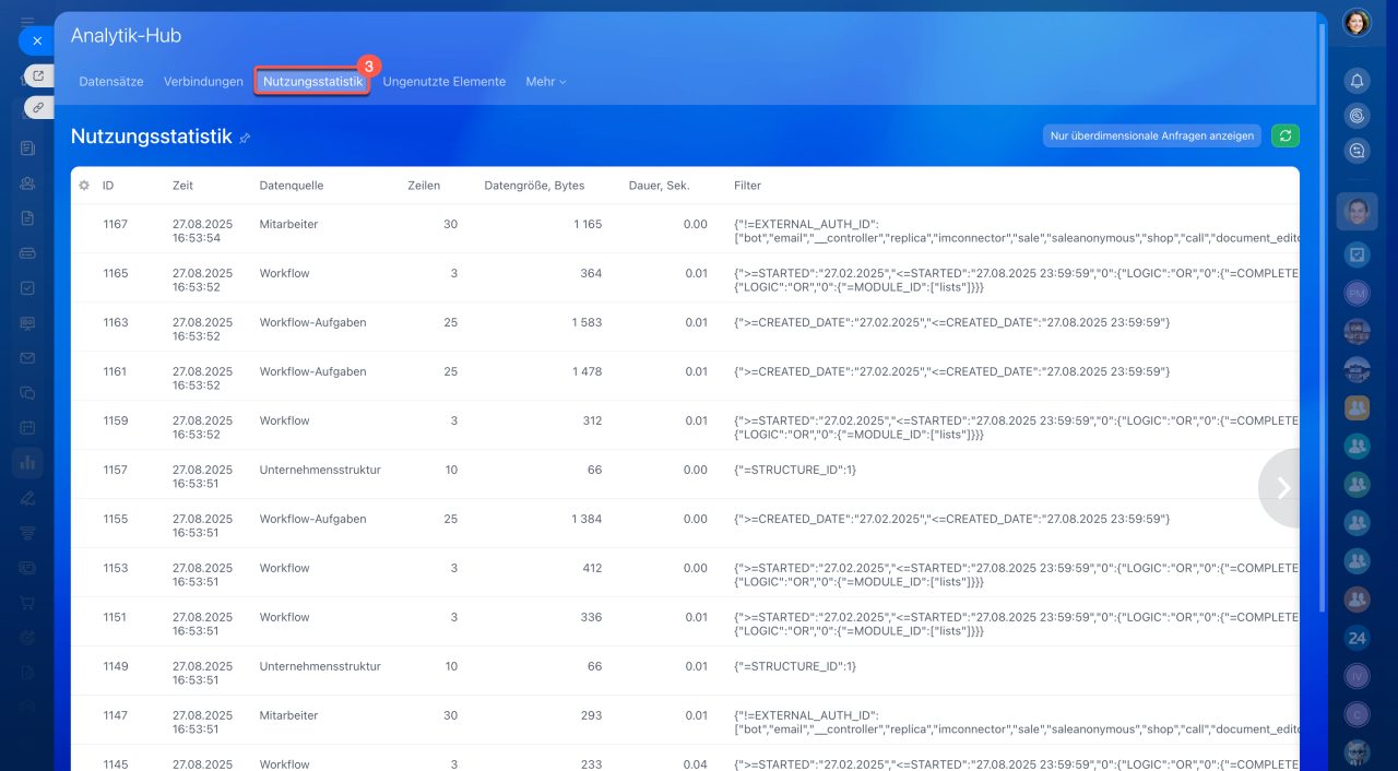- Die Nutzung von Abfragen können Sie im Bereich BI-Builder > Analytik-Hub > Nutzungsstatistik verfolgen. Hier werden die Anzahl der exportierten Zeilen, angewendete Filter und das geladene Datenvolumen angezeigt.
