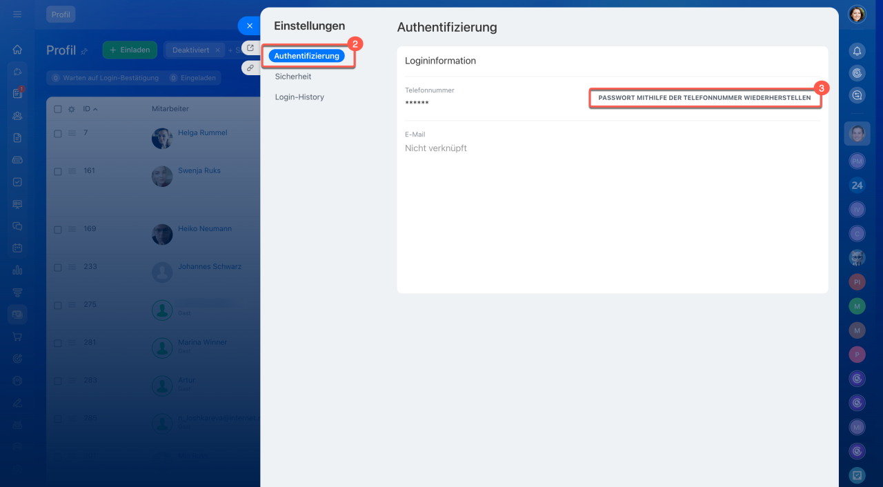 Passwort über den Bitrix24-Administrator wiederherstellen. Der Bitrix24 Administrator hat die Möglichkeit, einem Mitarbeiter einen Link zur Passwortrücksetzung zuzusenden. Wenn Sie Administratorrechte besitzen, öffnen Sie das Nutzerprofil des Mitarbeiters und klicken Sie auf Passwörter > Authetifizierung > Passwort per E-Mail wiederherstellen oder Passwort mithilfe der Telefonnummer wiederherstellen.