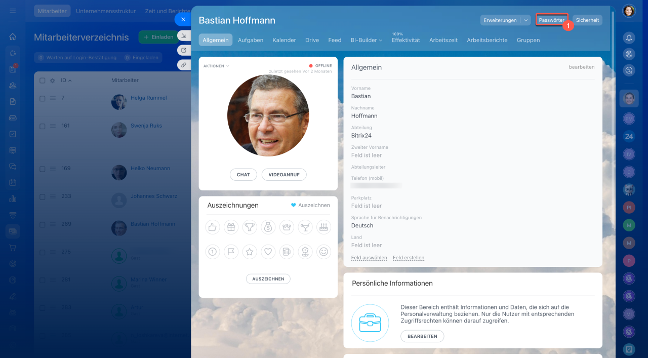 Passwort über den Bitrix24-Administrator wiederherstellen. Der Administrator kann das Passwort eines Mitarbeiters im Administrationsbereich ändern.