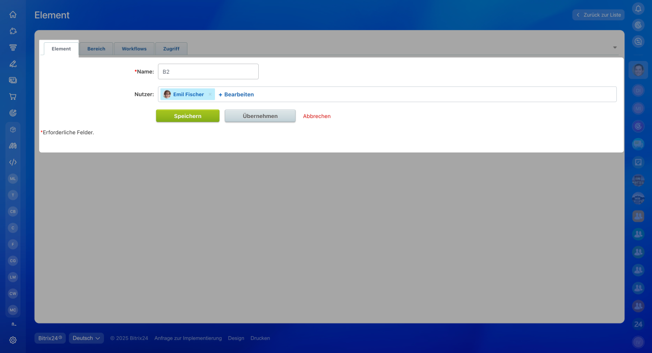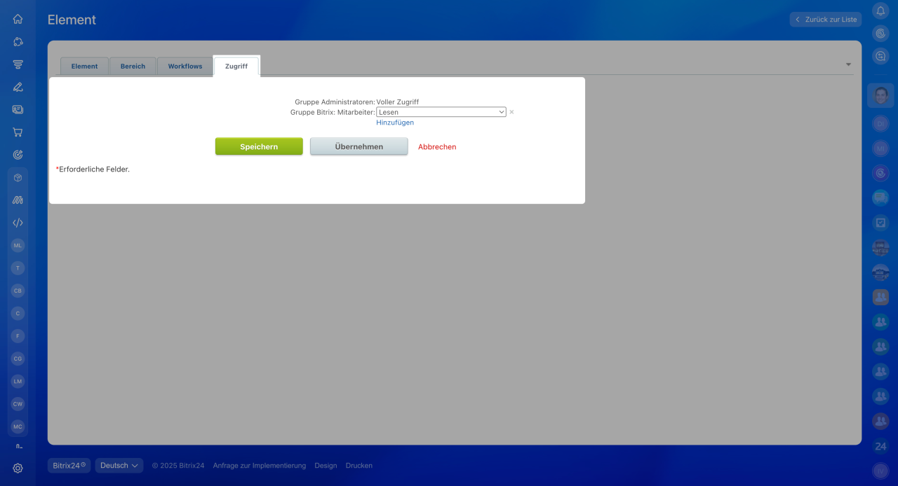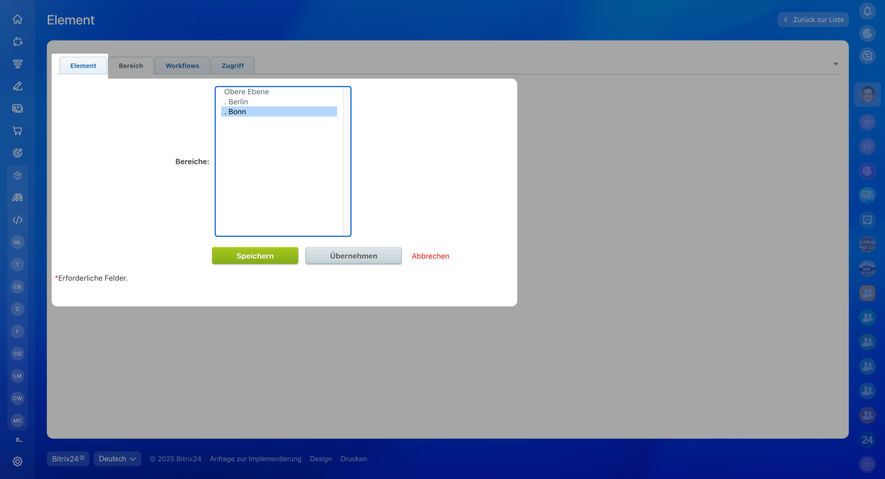 - Um ein Element hinzuzufügen, füllen Sie die Felder aus, wählen Sie einen Bereich aus, überprüfen Sie, ob Workflows für dieses Element gestartet wurden, und legen Sie die Zugriffsberechtigungen fest.