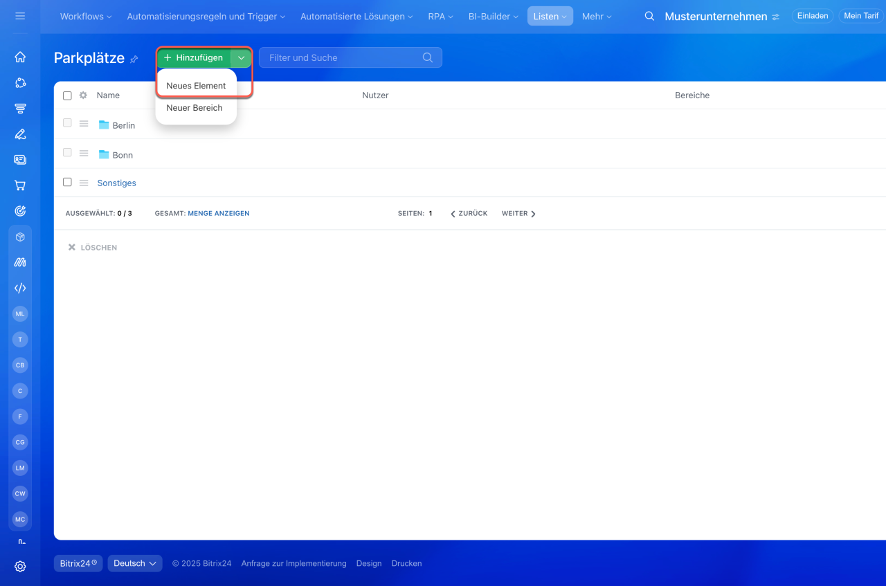 Um ein Element hinzuzufügen, öffnen Sie die gewünschte Liste und wählen Sie eine der folgenden Optionen: