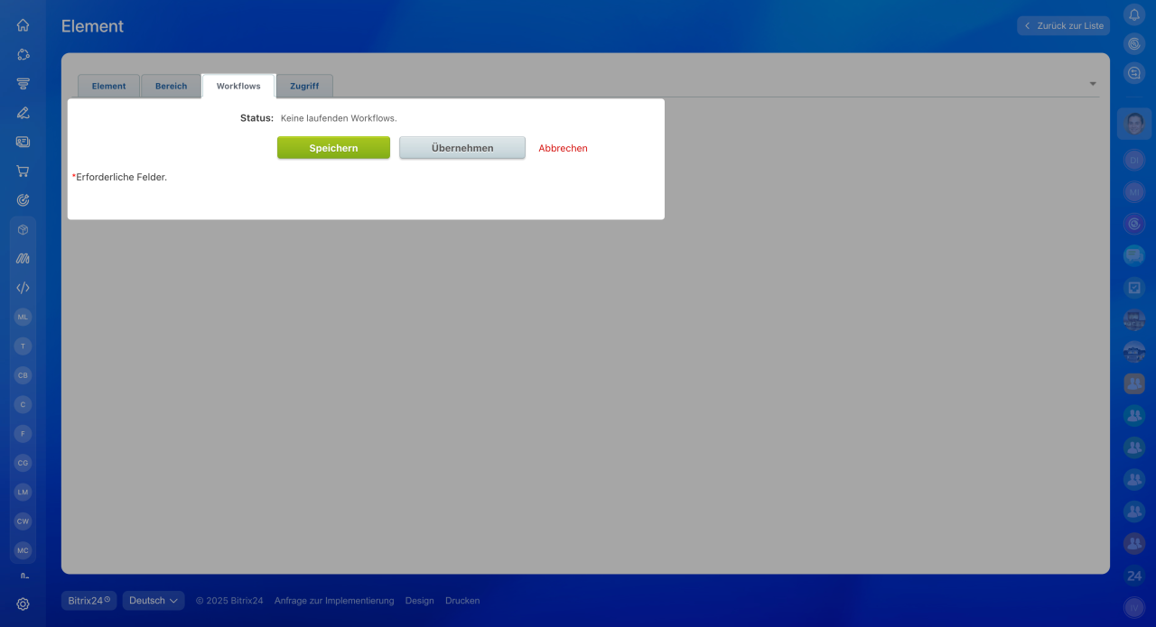 Workflows: In diesem Tab wird angezeigt, ob Workflows basierend auf diesem Element laufen.