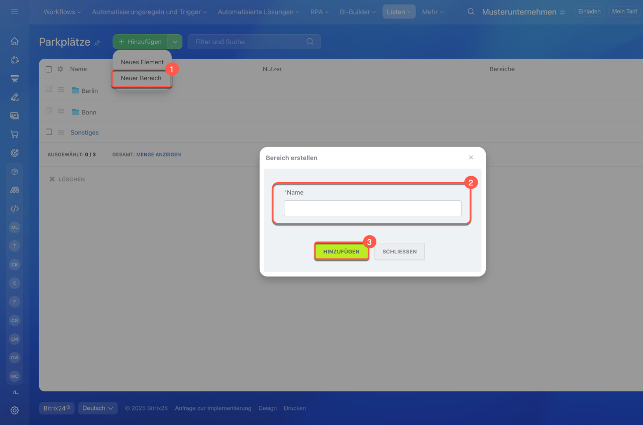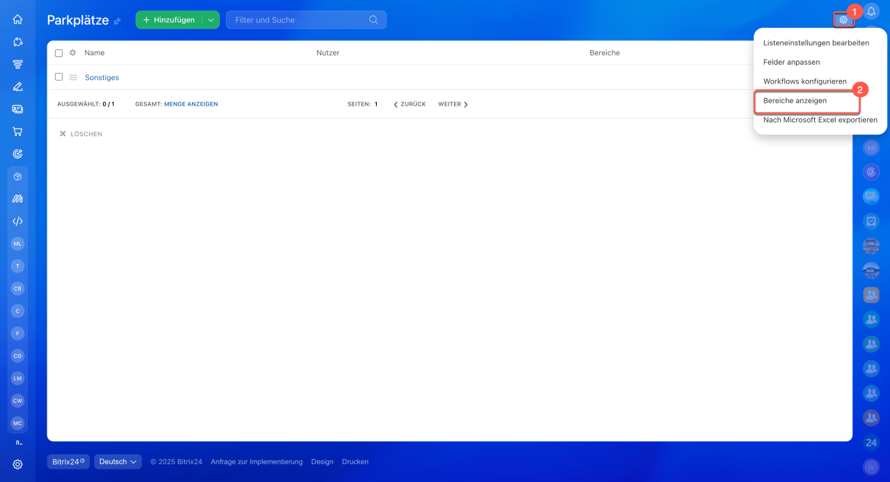 Bereiche funktionieren wie Ordner, um die Elemente Ihrer Liste zu organisieren. Beispielhaft können Sie Parkplätze nach Standort kategorisieren. Um einen Bereich hinzuzufügen:
