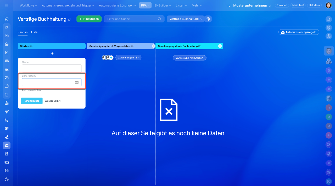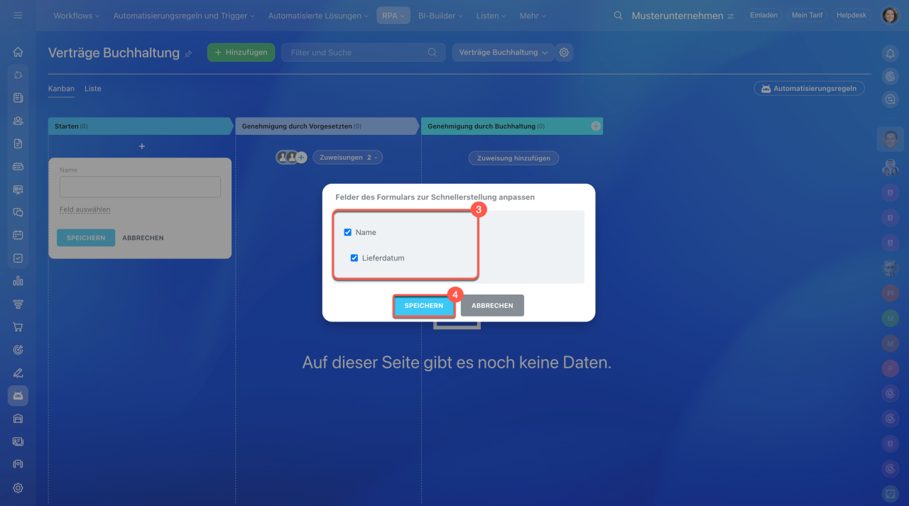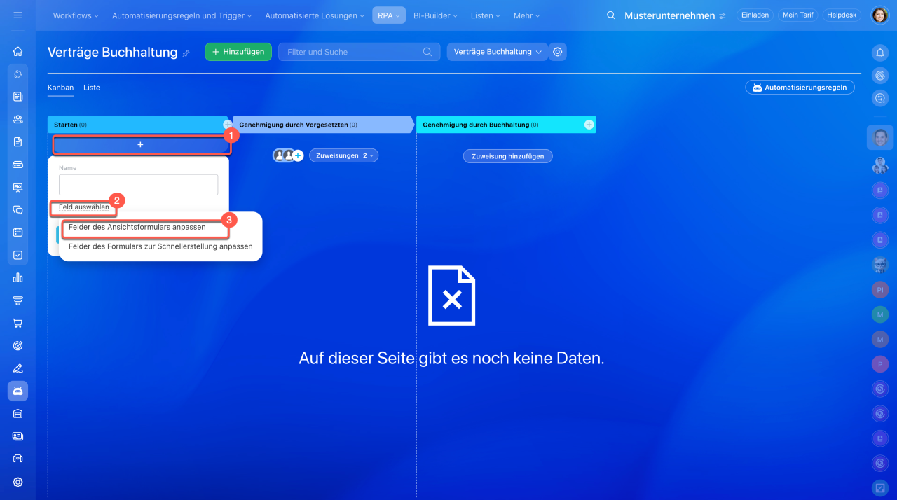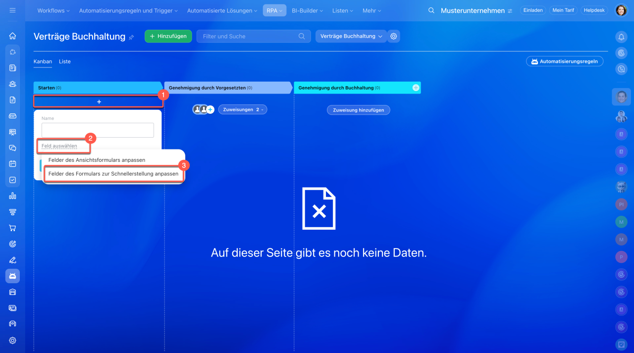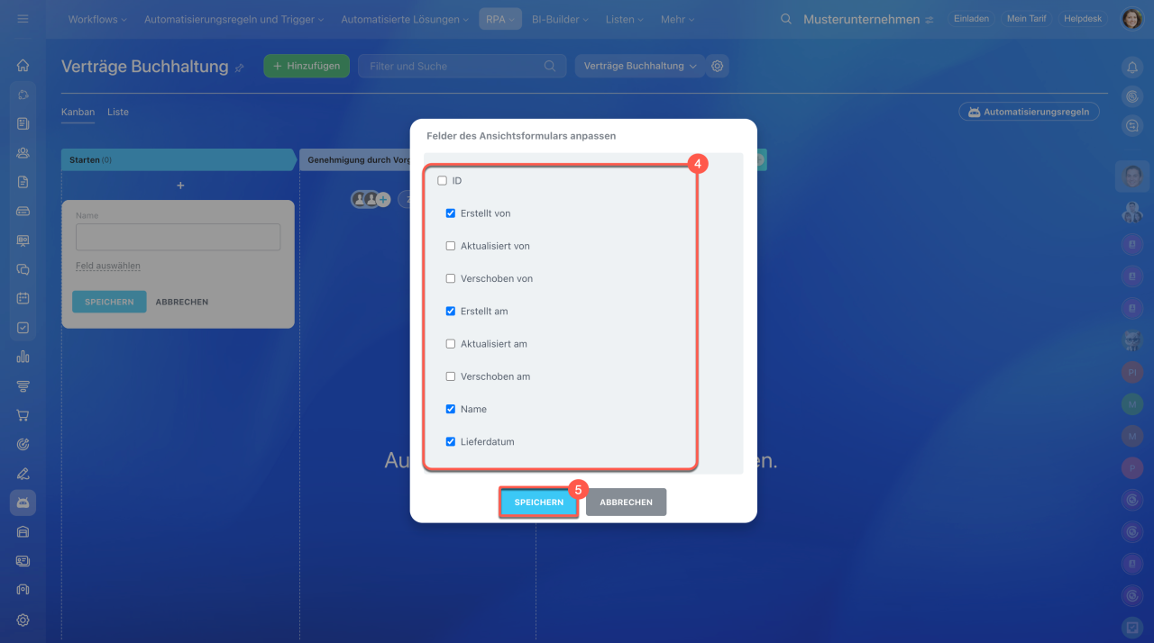Die im RPA-Bereich erstellten Workflows verfügen über eine Kanban-Ansicht, die eine intuitive Verwaltung und Erweiterung von Aufgaben ermöglicht. Sie haben dabei die Möglichkeit, die anzuzeigenden Felder sowohl für die Erstellung neuer Elemente als auch für den Ansichtsmodus individuell anzupassen.