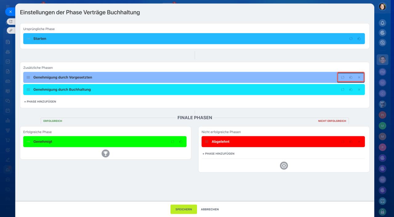 - Um eine Phase zu bearbeiten, bewegen Sie den Cursor über die Phase und klicken Sie auf den Bleistift. Hier können Sie die Farbe oder den Namen ändern oder unnötige Phasen löschen.