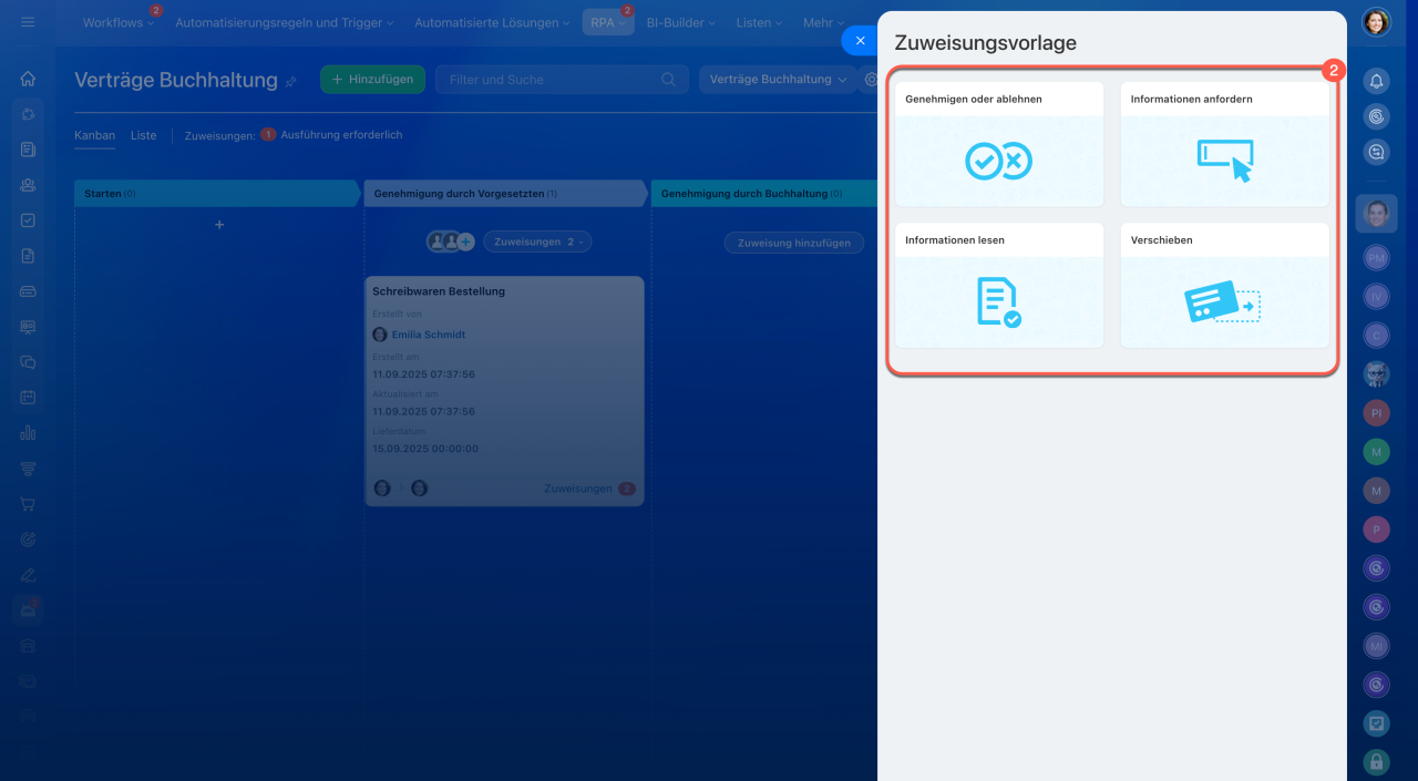 - Im Bereich RPA können Workflows effizient über eine Kanban-Ansicht verwaltet werden. Diese Ansicht ermöglicht es, Aufgaben durch verschiedene Phasen zu leiten, von der Initiierung bis zum Abschluss.
