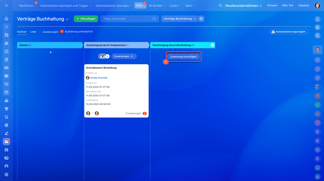 - Um eine Zuweisung hinzuzufügen, klicken Sie auf die Schaltfläche Zuweisung hinzuzufügen im Kanban, wählen Sie die gewünschte Zuweisung aus und konfigurieren Sie die Parameter.