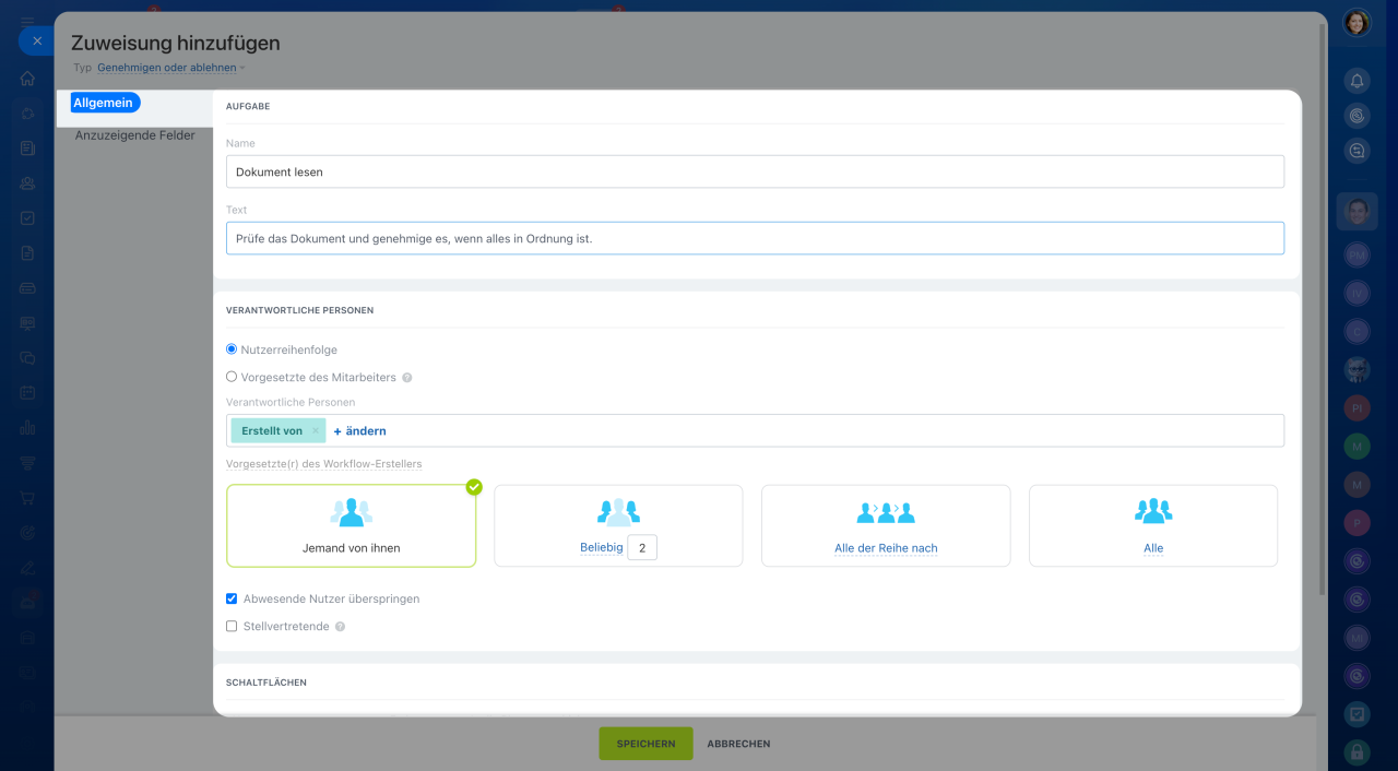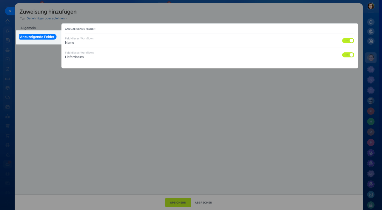 Im Tab Anzuzeigende Felder legen Sie fest, welche Felder dem Verantwortlichen im Formular angezeigt werden.