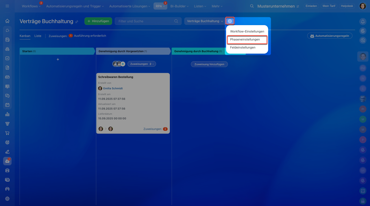 - Klicken Sie auf das Zahnrad im Kanban und wählen Sie den Punkt Phaseneinstellungen.