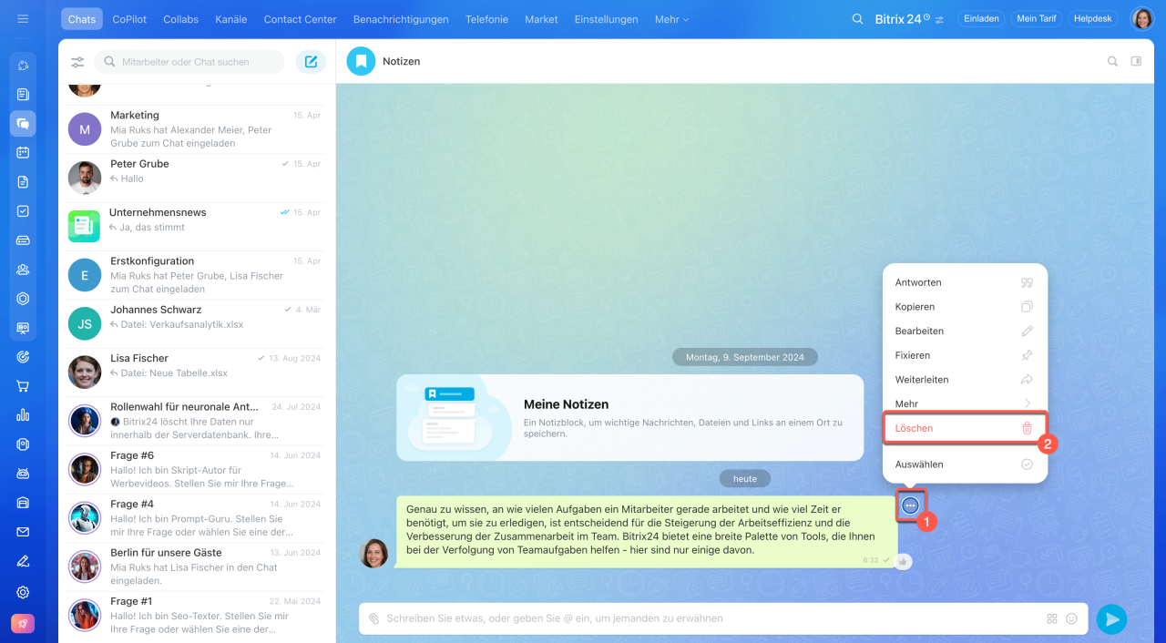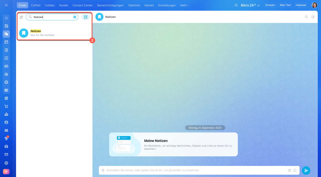 Notizen stellen einen persönlichen Chat in Bitrix24, der nur für Sie sichtbar ist. Perfekt für Konzeptentwürfe, persönliche Merklisten oder das Sammeln von Referenzmaterial – so behalten Sie den Überblick, ohne wichtige Gedanken in den Arbeitsdialogen zu verlieren.