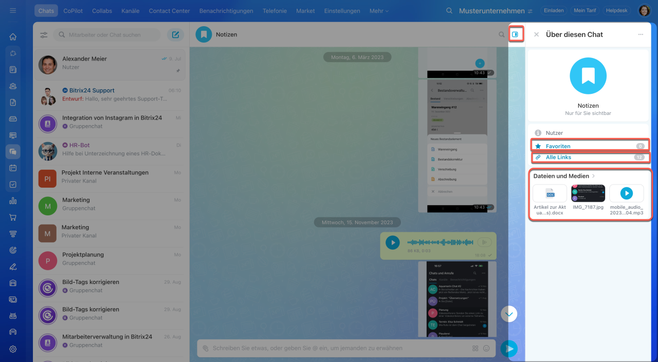Für den schnellen Zugriff auf Dokumente, Mediendateien und Links nutzen Sie die Seitenleiste (Sidebar) des Chats.