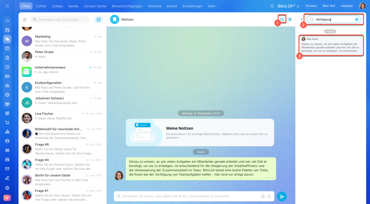 - Suchen Sie Ihre Notizen in der Chatliste.