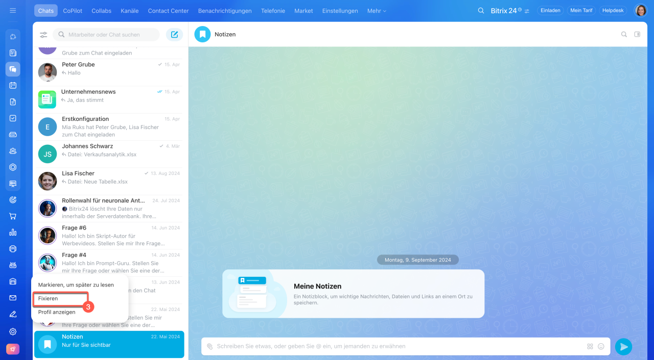 Fixieren Sie die Notizen, um sie dauerhaft in der Chatliste zu behalten: