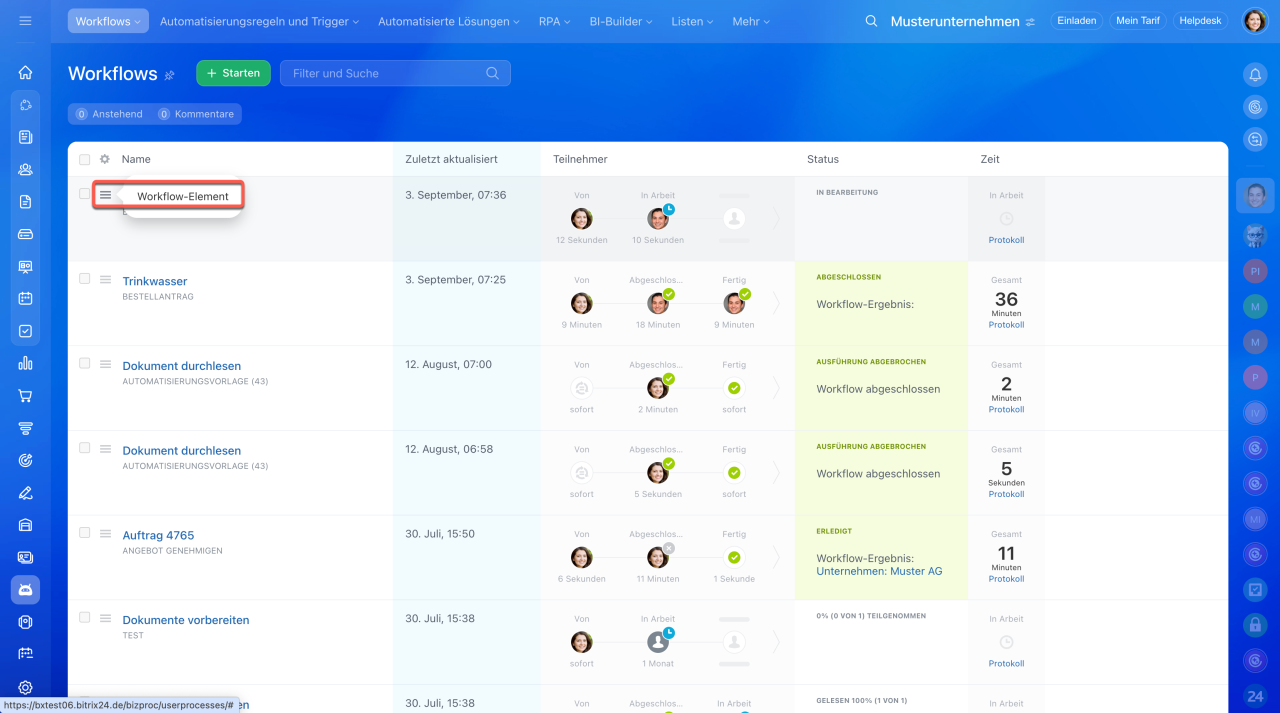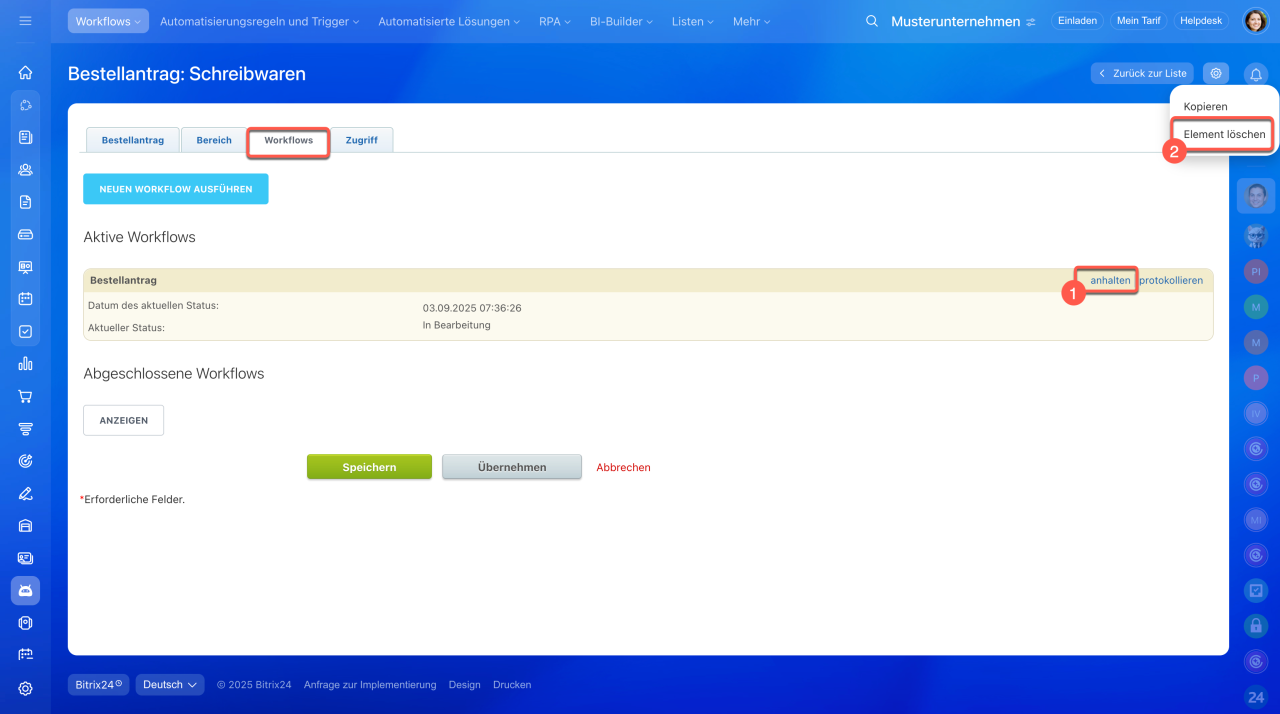 Öffnen Sie den Bereich Automatisierung > Workflows. Finden Sie das fälschlicherweise erstellte Element und klicken Sie auf Menü (≡) > Workflow-Element.