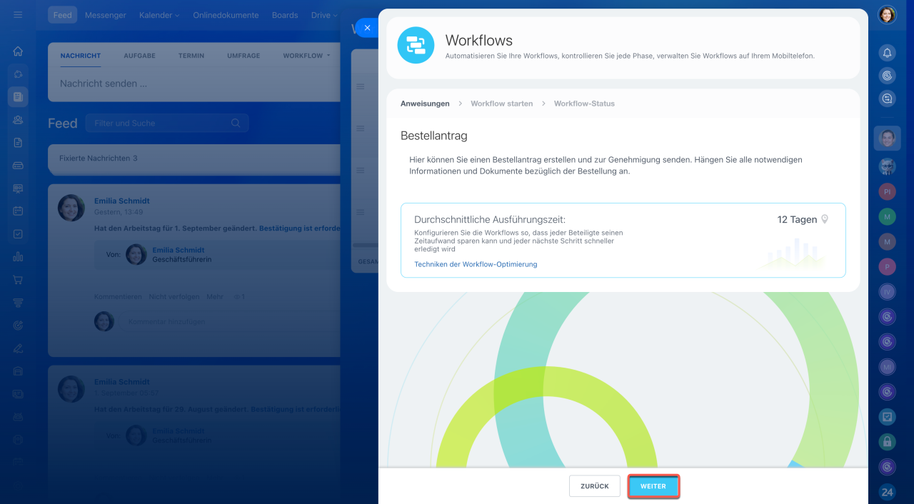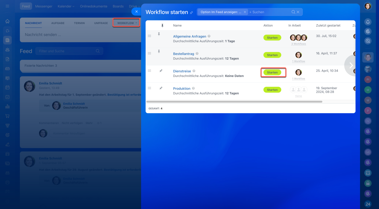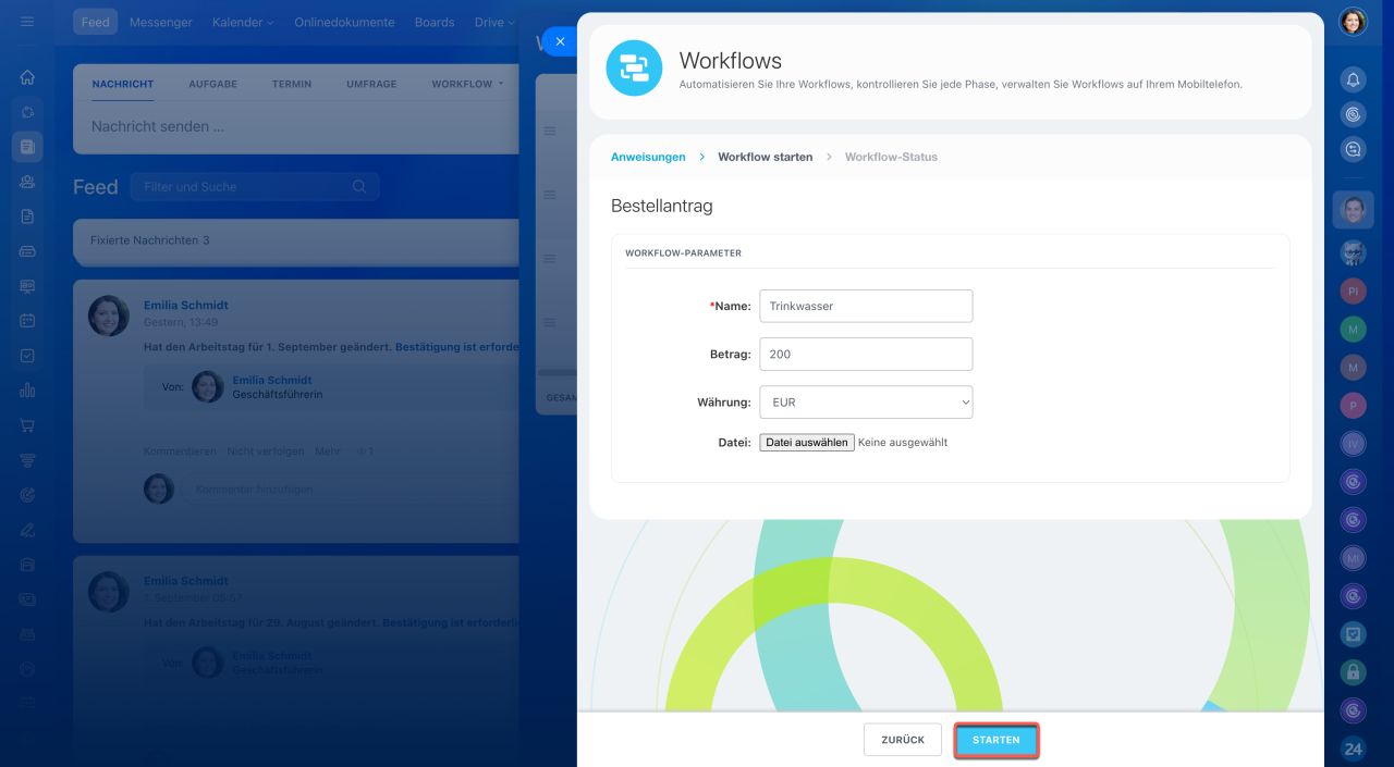 Öffnen Sie den Bereich Feed > Mehr > Workflows > Bestellantrag. Klicken Sie auf Starten.