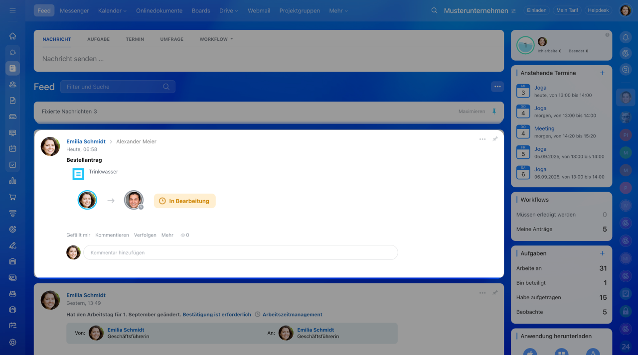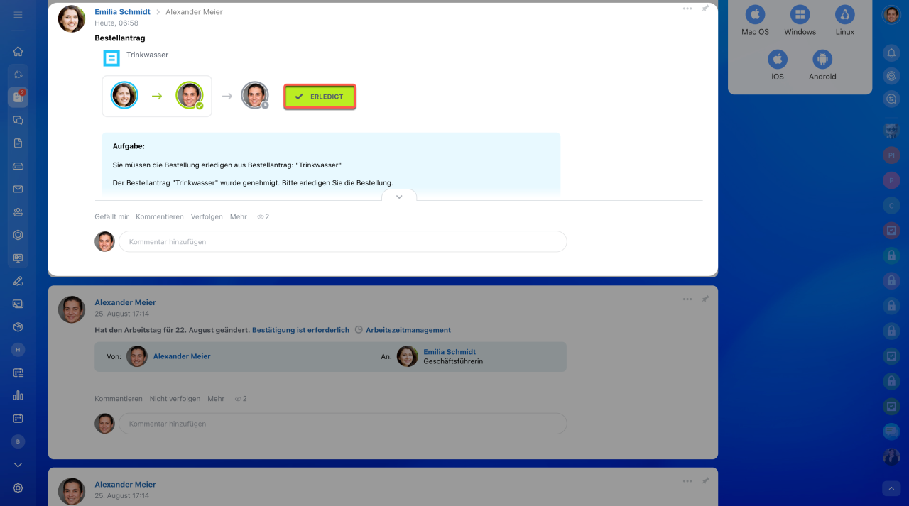 Sie können direkt aus dem Feed können Sie einen Bestellantrag erstellen und zur Genehmigung senden.