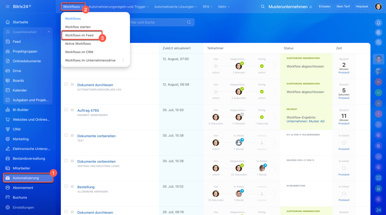 1-3. Öffnen Sie den Bereich Automatisierung > Workflows > Workflows im Feed.