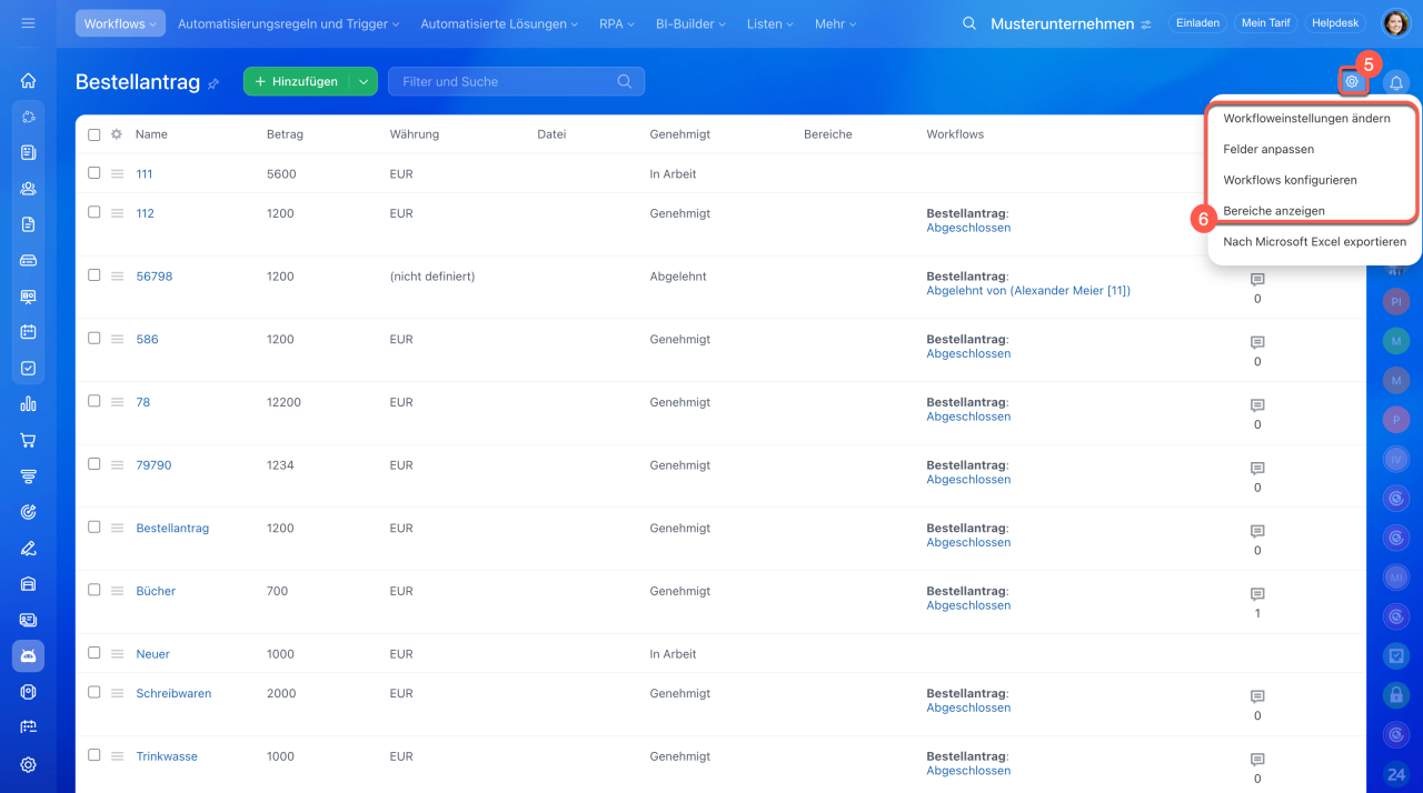 Um alle Ihre Anfragen zu überprüfen, öffnen Sie den Bereich Automatisierung > Workflows und wenden Sie den Filter Gestartet von mir an.