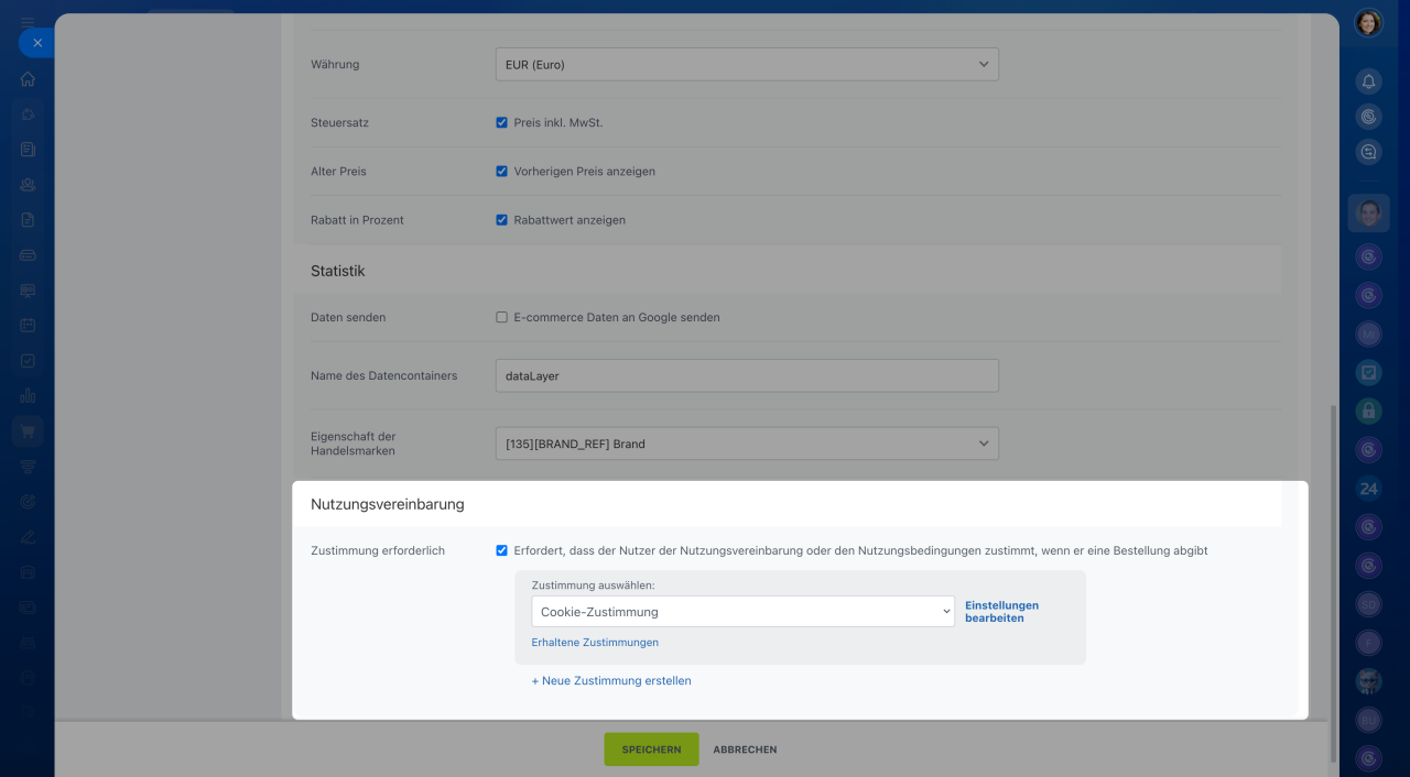Zustimmung erforderlich: Aktivieren Sie diese Option und wählen Sie die Zustimmung aus, der Kunden beim Bestellen akzeptieren sollten.