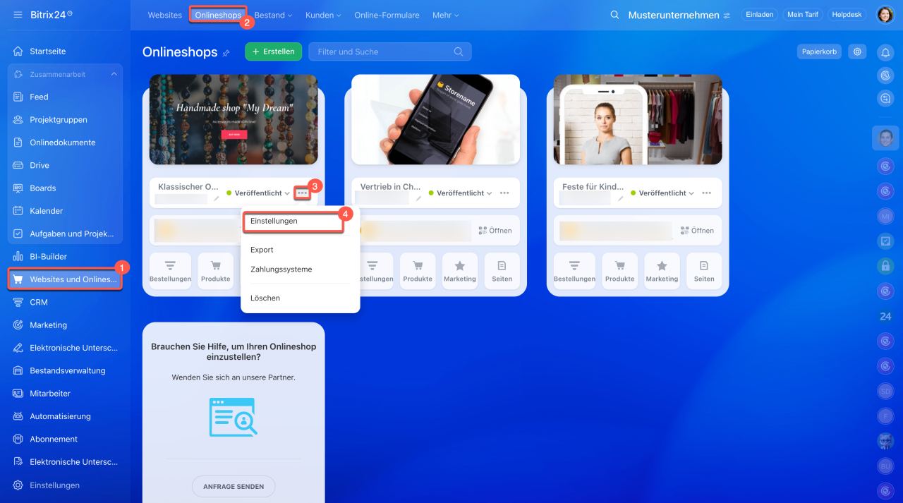 - Öffnen Sie den Bereich Websites und Shops.