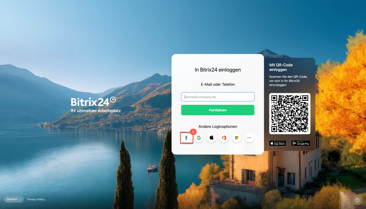 - In Bitrix24 können Sie sich mit Ihrem Login und Passwort, über soziale Netzwerke oder per QR-Code anmelden.