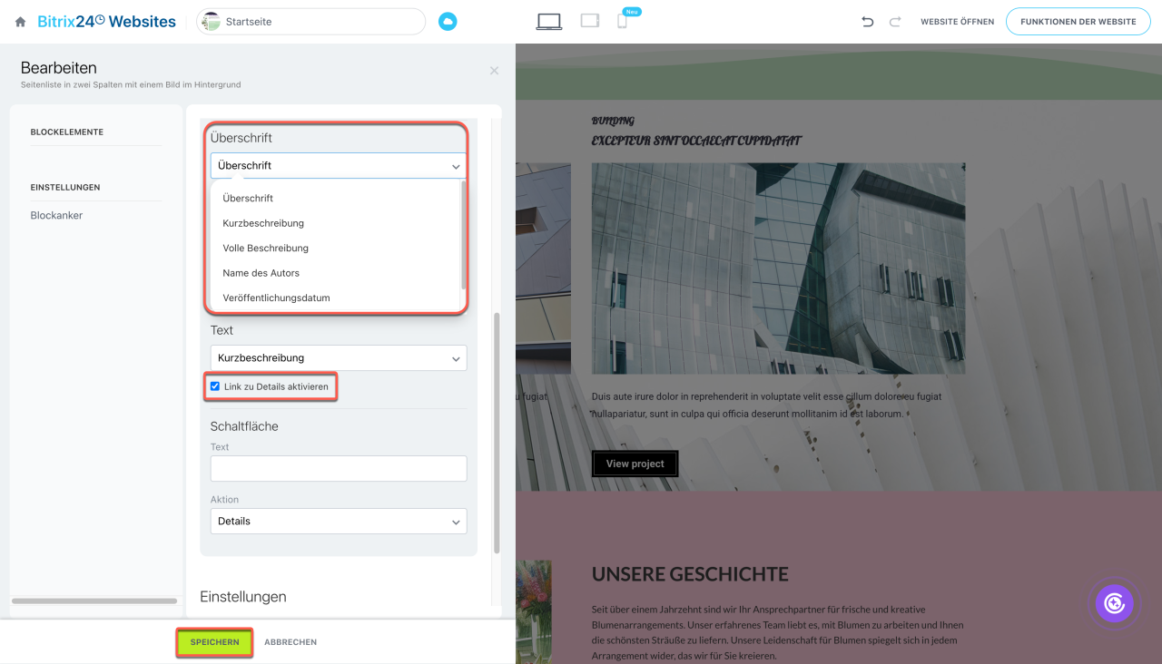 Wenn Sie möchten, dass die Detailseite der Nachricht durch Klicken auf den Titel, das Bild oder ein anderes Element geöffnet wird, aktivieren Sie unter dem jeweiligen Element die Option Link zu Details aktivieren. Speichern Sie die Einstellungen.