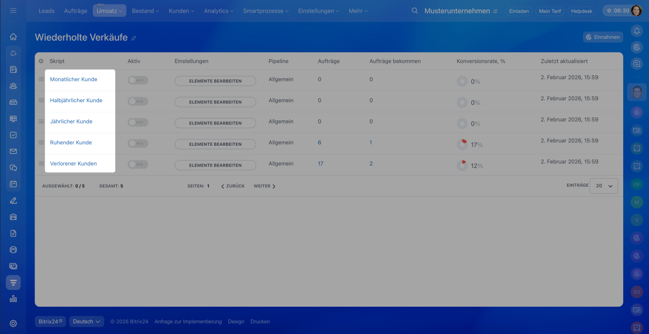 - Öffnen Sie den Bereich CRM > Umsatz > Wiederholte Verkäufe und wählen Sie aus, nach welchen Skripts automatisch wiederkehrende Aufträge erstellt werden sollen: monatliche, halbjährliche oder jährliche Käufe.