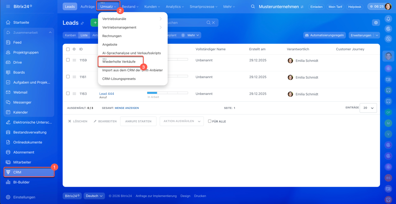 1–3. Öffnen Sie den Bereich CRM > Aufträge > wiederholte Verkäufe.