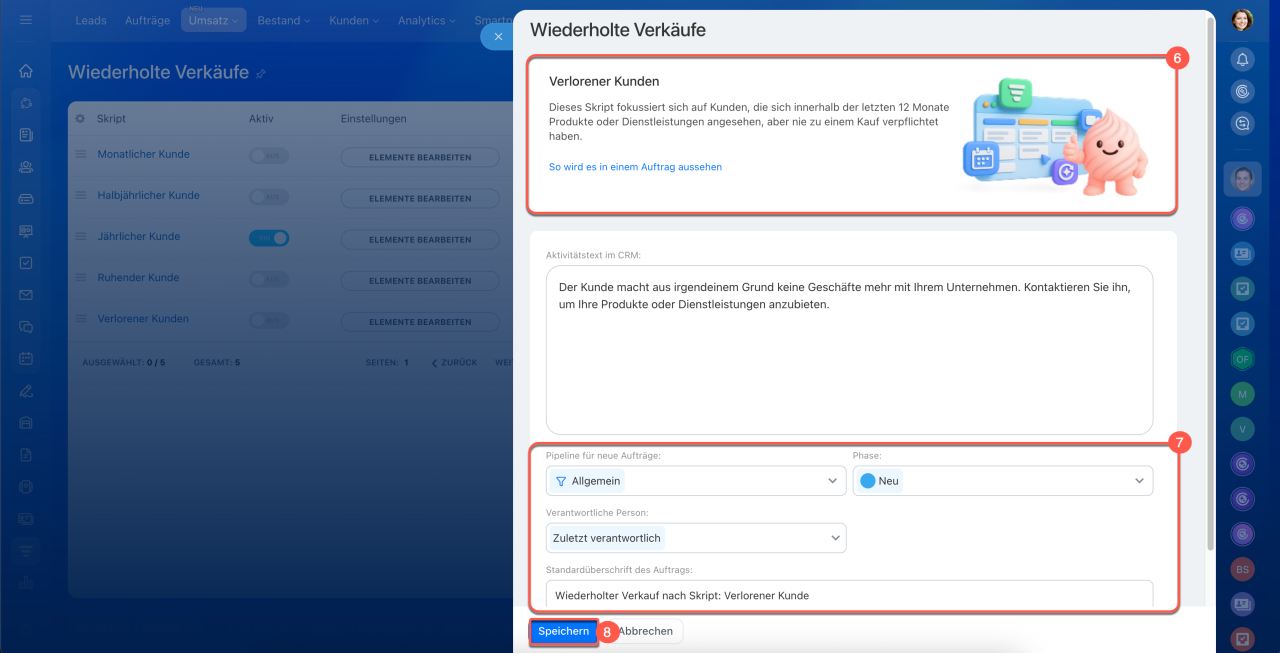 4. Wählen Sie aus, welche Skripts aktiviert werden sollen. AI erstellt automatisch Aufträge basierend auf diesen Skripts. Wenn beispielsweise nur das Skript Halbjährlicher Kunde aktiviert ist, sucht AI nach entsprechenden Kunden und erstellt wiederkehrende Aufträge für sie. Andere Skripts werden nicht berücksichtigt.