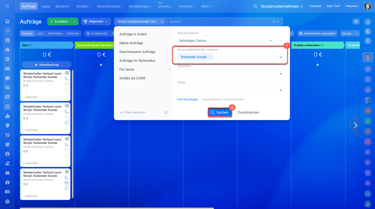 - Um alle Aufträge zu finden, die automatisch durch wiederholte Verkäufe mit AI erstellt wurden, verwenden Sie den Filter Skript wiederholender Verkäufe.