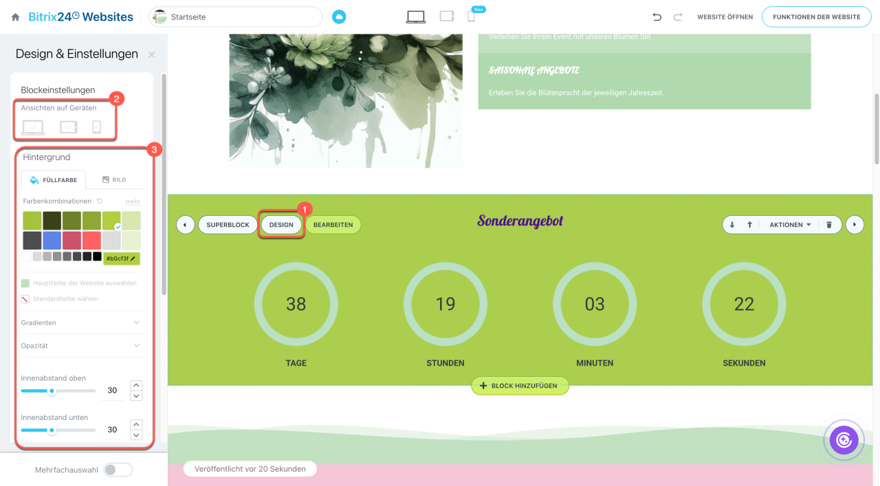 Bearbeiten. Bearbeiten Sie die Einstellungen und den Inhalt des Blocks, z. B. die Überschrift, Beschriftungen der Elemente oder das Enddatum des Timers. Klicken Sie auf Speichern.