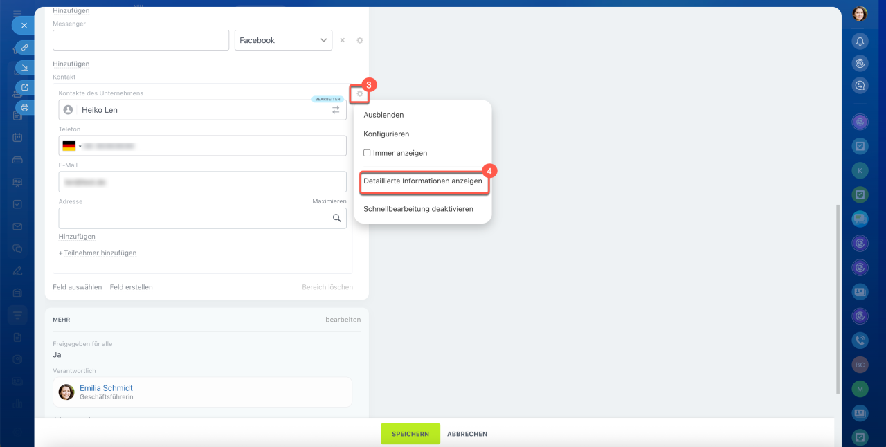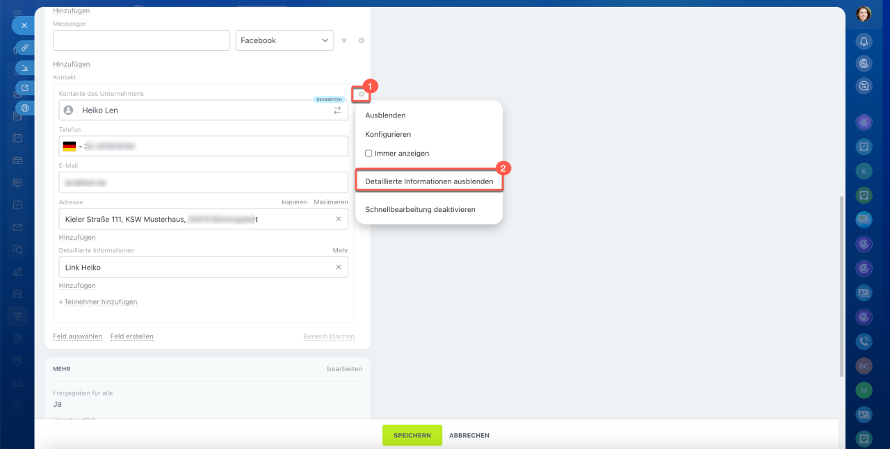 1–2. Klicken Sie auf Einstellungen (⚙️) oben rechts im Feld Kontakte und wählen Sie Detaillierte Informationen ausblenden. Im Formular bleibt nur die Hauptinformation zu den verknüpften Kontakten sichtbar.