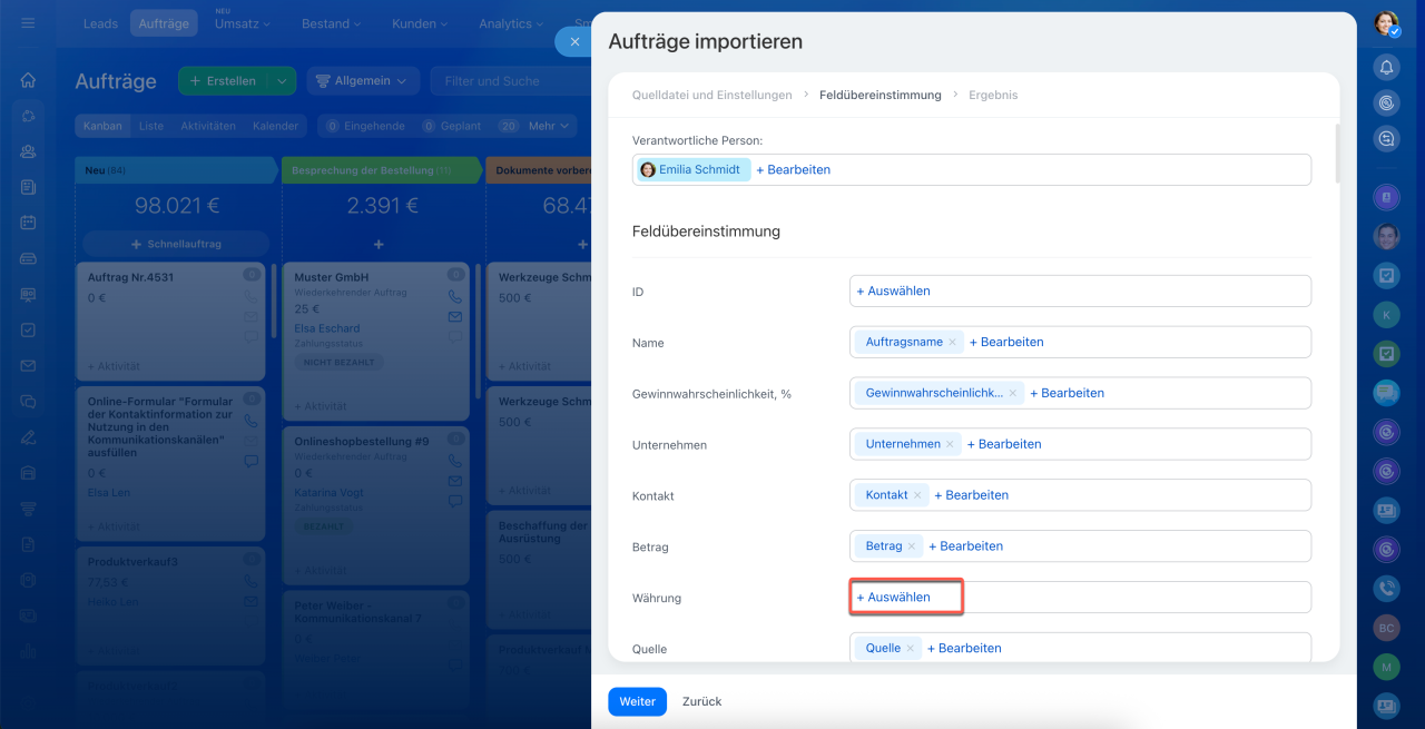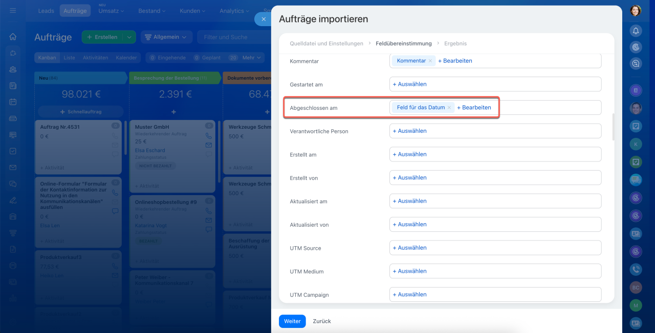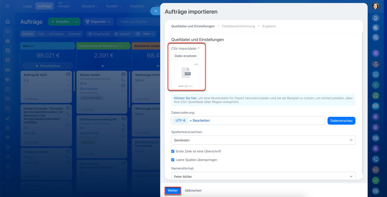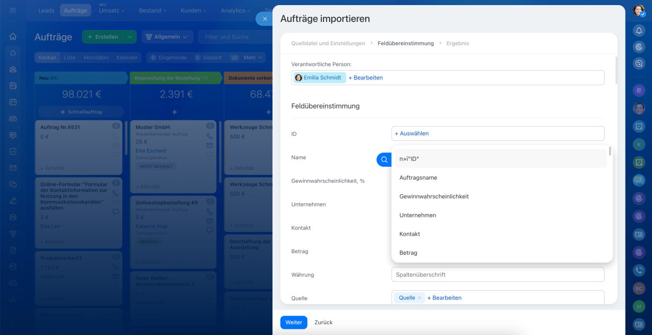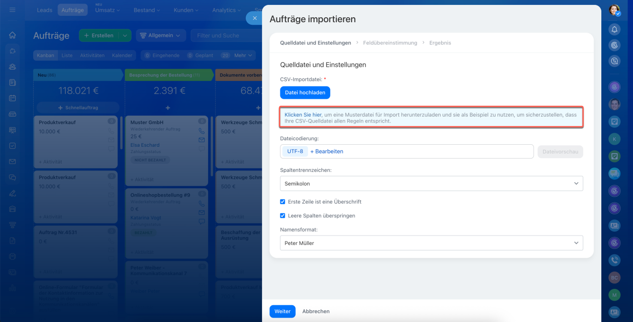 Öffnen Sie CRM und wählen Sie den gewünschten Bereich aus, z. B. Aufträge. Klicken Sie auf Einstellungen (⚙️) > Aufträge importieren.